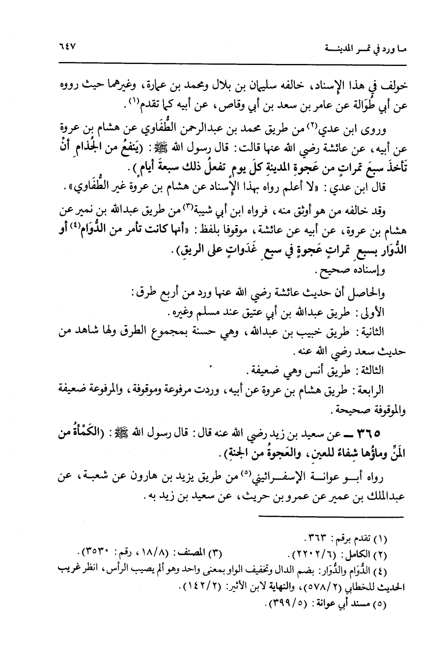 365 - عن سعيد بن زيد رضي الله عنه قال: قال رسول الله صلى الله عليه وسلم: (الكماة من المن وماوها شفاء للعين, والعجوة من الجنة).