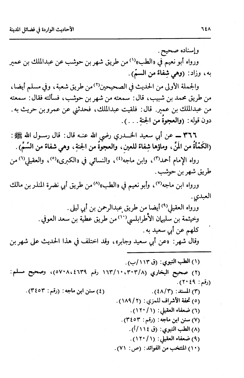 366 - عن أبي سشعيد الخدري رضي الله عنه قال: قال رسول الله صلىالله عليه وسلم: (الكماة من المن, وماؤها شفاء للعين, والعجوة من الجنة, وهي شفاء من السم).