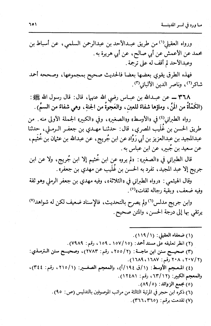 368 - عن عبد الله بن عباس رضي الله عنهما، قال: قال رسول الله صلى الله عليه وسلم: (الكمأة من المن، وماؤها شفاء للعين، والعجوة من الجنة، وهي شفاء من السم).