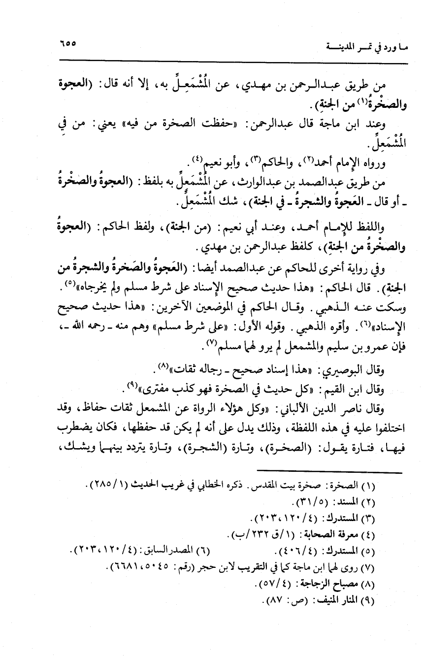 واللفظ للامام أحمد، وعند أبي نعيم: (من الجنة)، ولفظ الحاكم: (العجوة والصخرة من الجنة)، كلفظ عبد الرحمن بن مهدي.