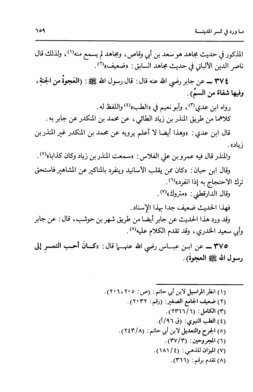 374 - عن جابر رضي الله عنه قال: قال رسول الله صلى الله عليه وسلم: (العجوة من الجنة، وفيها شفاء من السم).