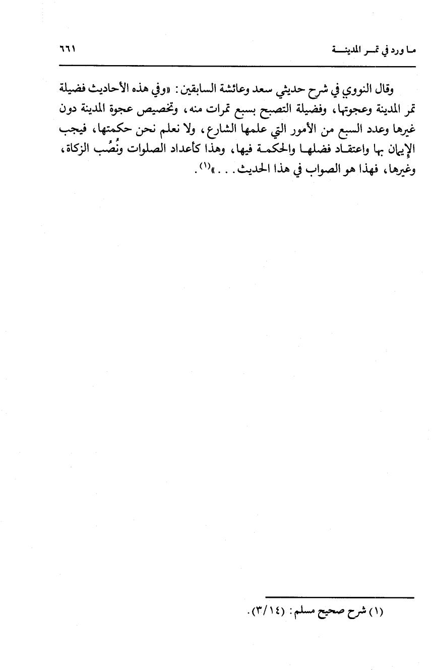 وقال النووي في شرح حديثي سعد وعائشة السابقين: ((وفي هذه الأحاديث فضيلة تمر المدينة وعجوتها وفضيلة التصبح بسبع تمرات منه، وتخصيص عجوة المدينة دون غيرها وعدد السبع من الأمور التي علمها الشارع، ولا نعلم نحن حكمتها، فيجب الايمان بها واعتقاد فضلها والحكمة فيها، وهذا كأعداد الصلوات ونصب الزكاة، وغيرها، فهذا هو الصواب في هذا الحديث ... )) (1).