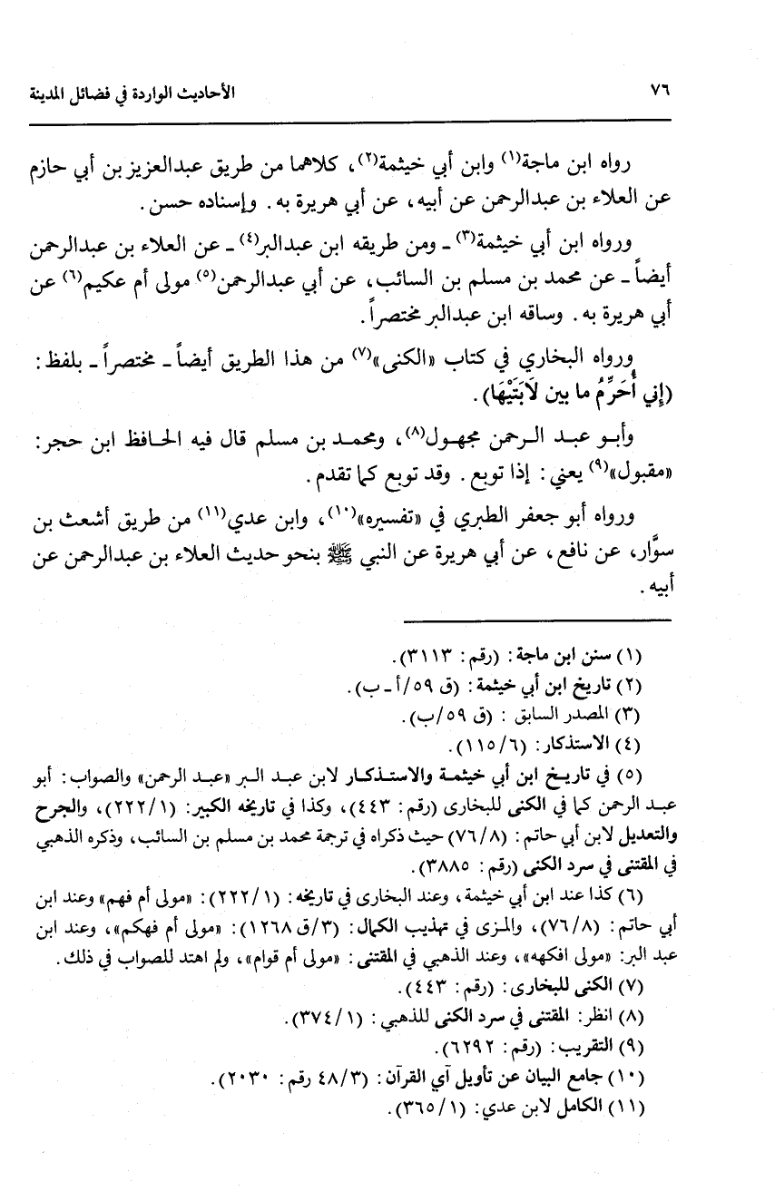 ورواه ابن أبي خيثمة (3) - ومن طريقه ابن عبد البر (4) - عن العلاء بن عبد الرحمن أيضاً - عن محمد بن مسلم بن السائب، عن أبي عبد الرحمن (5) مولى أم عكيم (6) عن أبي هريرة به.