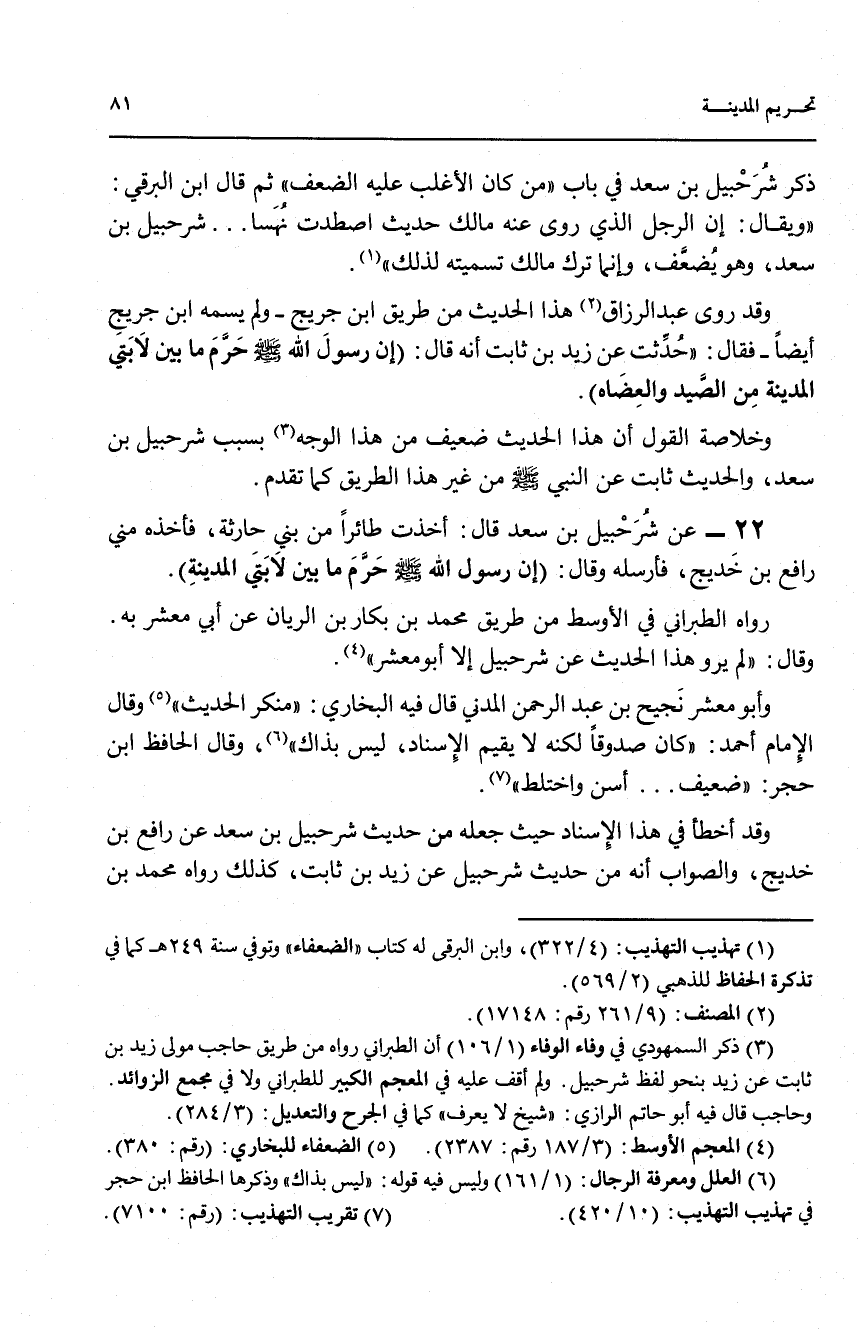 ذكر شرحبيل بن سعد في باب ((من كان الأغلب عليه الضعف)) ثم قال ابن البرقي: ((ويقال: إن الرجل الذي روى عنه مالك حديث اصطدت نهسا ... شرحبيل بن سعد، وهو يضعف، وإنما ترك مالك تسميته لذلك)) (1) وقد روىعبد الرزاق (2) هذا الحديث من طريق ابن جريج - ولم يسمه ابن جريج أيضاً - فقال: ((حدثت عن زيد بن ثابت أنه قال: (إن رسولالله صلى الله عليه وسلم حرم ما بين لابتي المدينة من الصيد والعضاه).
