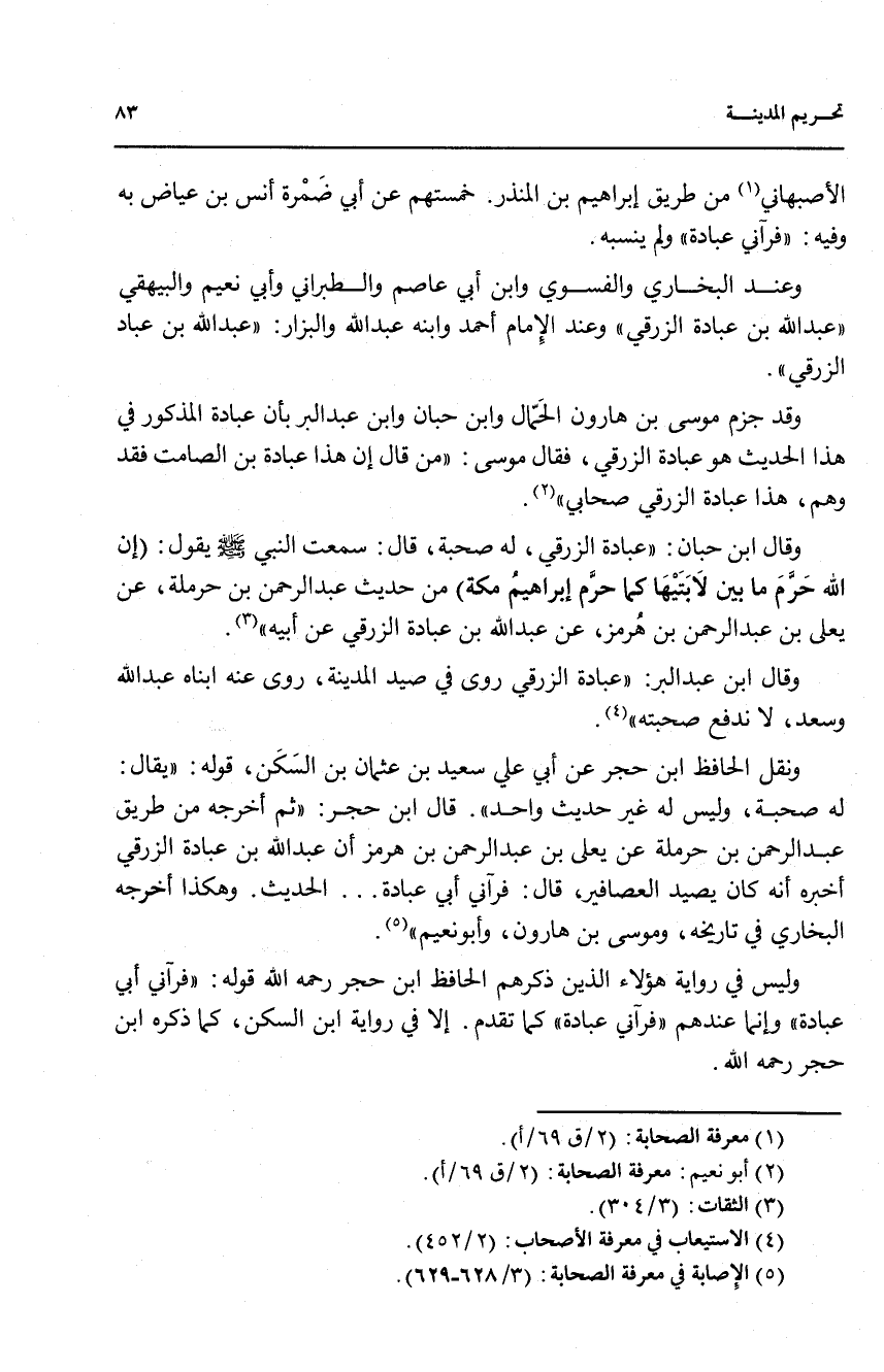 وقال ابن حبان: ((عبادة الزرقي، له صحبة، قال: سمعت النبي صلى الله عليه وسلم يقول: (إن الله حرم ما بين لابتيها كما حرم إبراهيم مكة) من حديث عبد الرحمن بن حرملة، عن يعلى بن عبد الرحمن بن هرمز، عن عبد الله بن عبادة الزرقي عن أبيه)) (3).