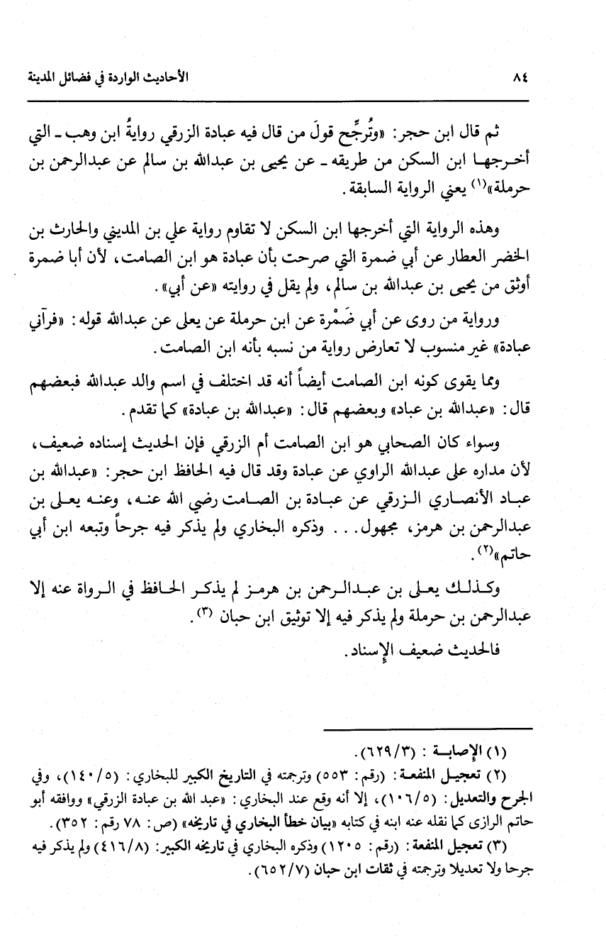 (2) تعجيل المنفعة: (رقم: 553) وترجمته في التاريخ الكبير للبخاري: (140/ 5)، وفي الجرح والتعديل: (106/ 5)، إلا انه وقع عند البخاري: ((عبد الله بن عبادة الزرقي)) ووافقه أبو حاتم الرازي كما نقله عنه ابنه في كتابه ((بيان خطأ البخاري في تاريخه)) (ص: 78 رقم: 352).
