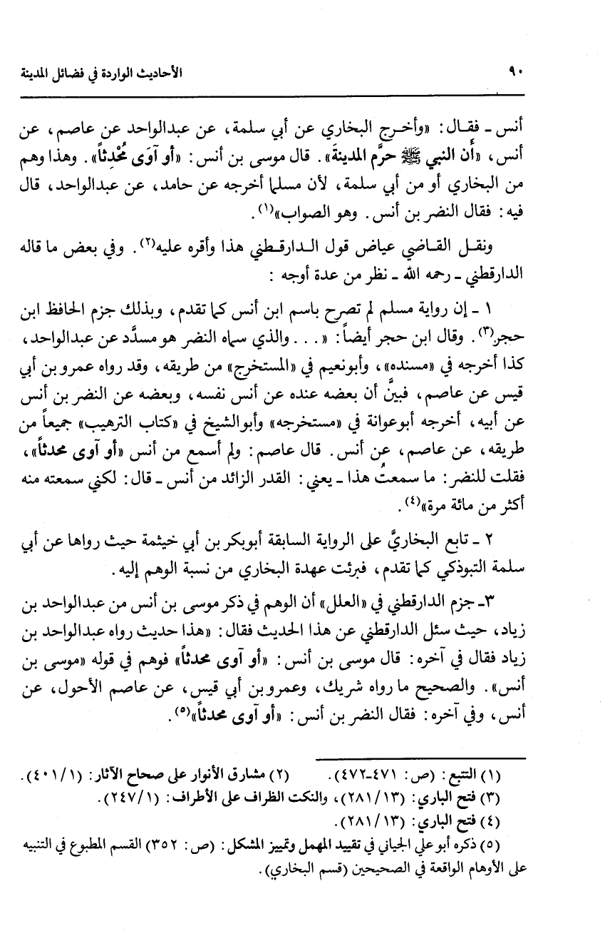 أنس - قال: ((وأخرج البخاري عن أبي سلمة، عن عبد الواحد عن عاصم، عن أنس، ((أن النبي صلى الله عليه وسلم حرم المدينة))، قال موسى بن أنس: ((أو آوى محدثاً)).