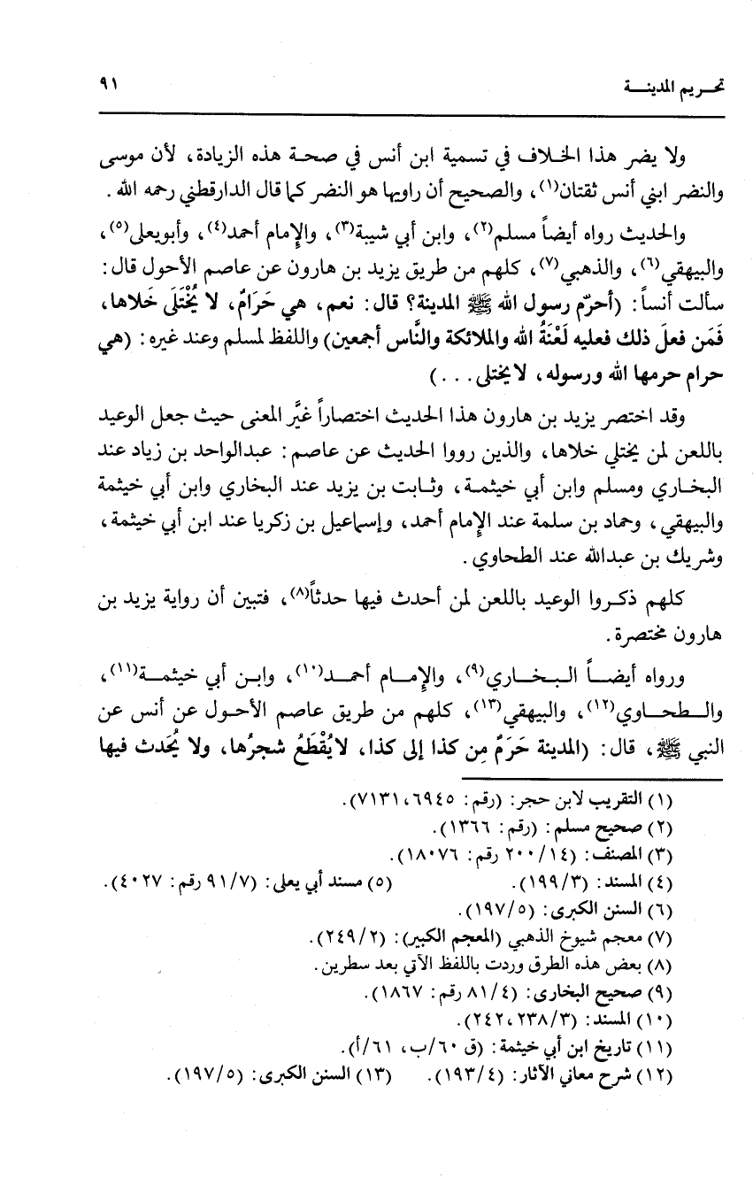 ورواه أيضاً البخاري (9)، والإمام أحمد (10)، وابن أبي خيثمة (11)، والطحاوي (12)، والبيهقي (13)، كلهم من طريق عاصم الأحوال عن أنس عن النبي صلى الله عليه وسلم، قال: (المدينة حرم من كذا إلى كذا، لا يقطع شجرها، ولا يحدث فيها