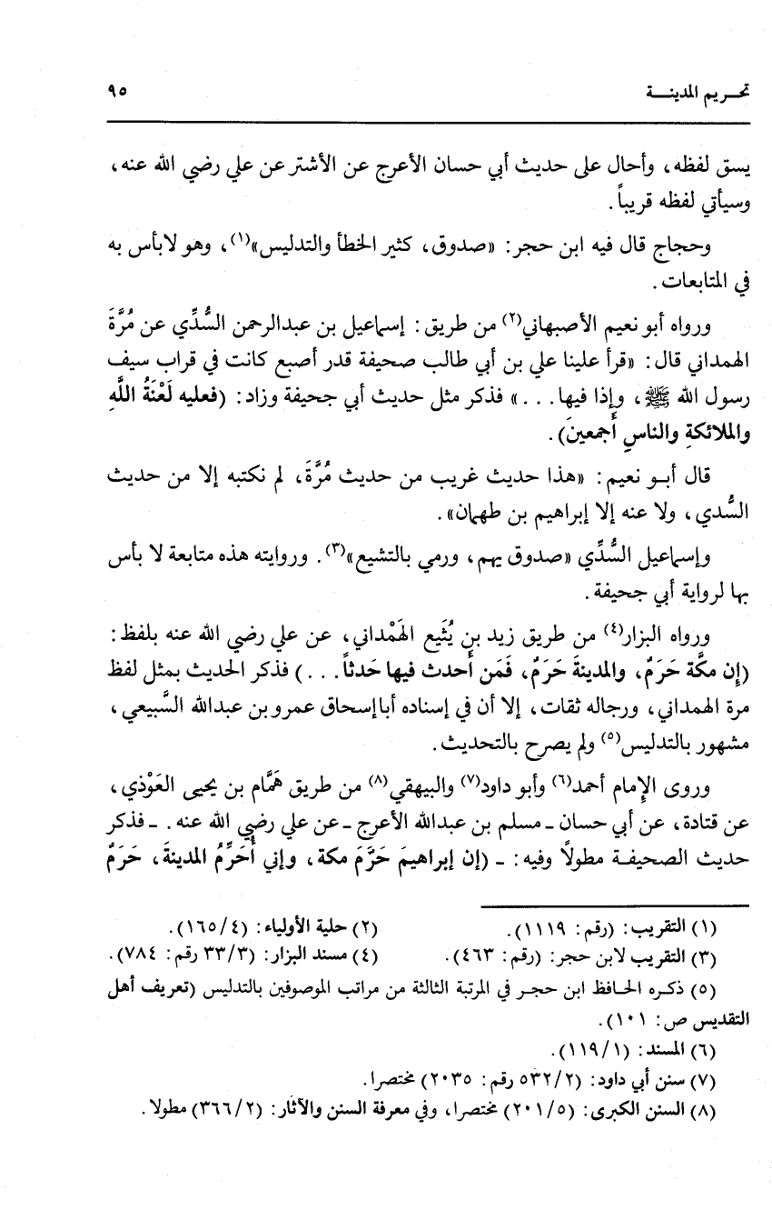 وروى الإمام أحمد (6) وأبو داود (7) والبيهقي (8) من طريق همام بن يحيى العوذي، عن قتادة، عن أبي حسان - مسلم بن عبد الله الأعرج - عن علي رضي الله عنه - فذكر حديث الصحيفة مطولاً وفيه:- (إن إبراهيم حرم مكة، وإني أحرم المدينة - حرم