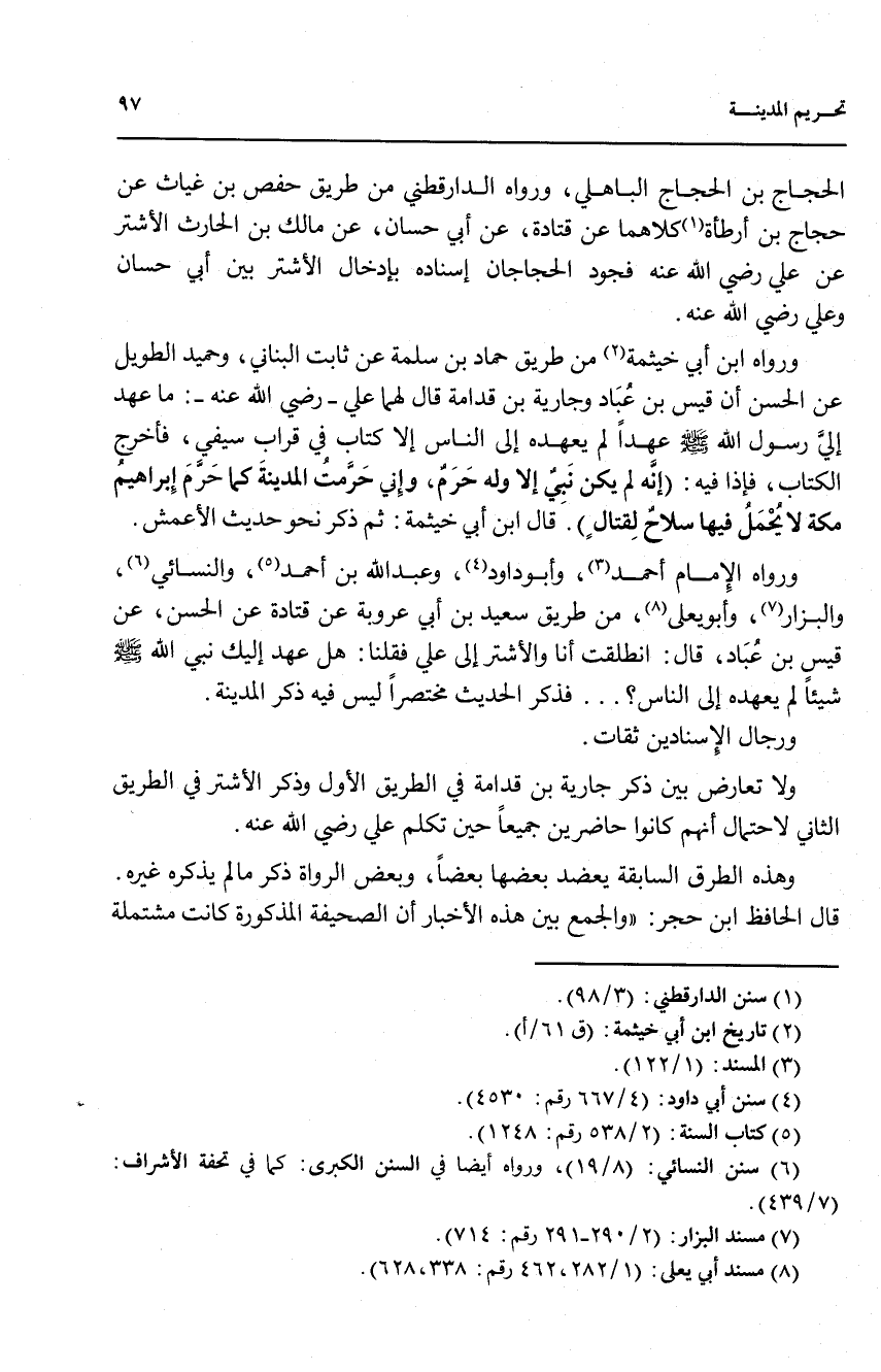 ورواه ابن أبي خيثمة (2) من طريق حماد بن سلمة عن ثابت البناتي - وحميد الطويل عن الحسن أن قيس بن عباد وجارية بن قدامة قال لهما علي - رضي الله عنه:- ما عهد إلي رسول الله صلى الله عليه وسلم عهداًلم يعهده إلى الناس إلا كتاب في قراب سيفي، فأخرج الكتاب، فإذا فيه: (إنه لم يكن نبي إلا وله حرم، وإني حرمت المدينة كما حرم إبراهيم مكة لا يحمل فيها سلاحاً لقتال). قال ابن أبي خيثمة: ثم ذكر نحو حديث الأعمش.