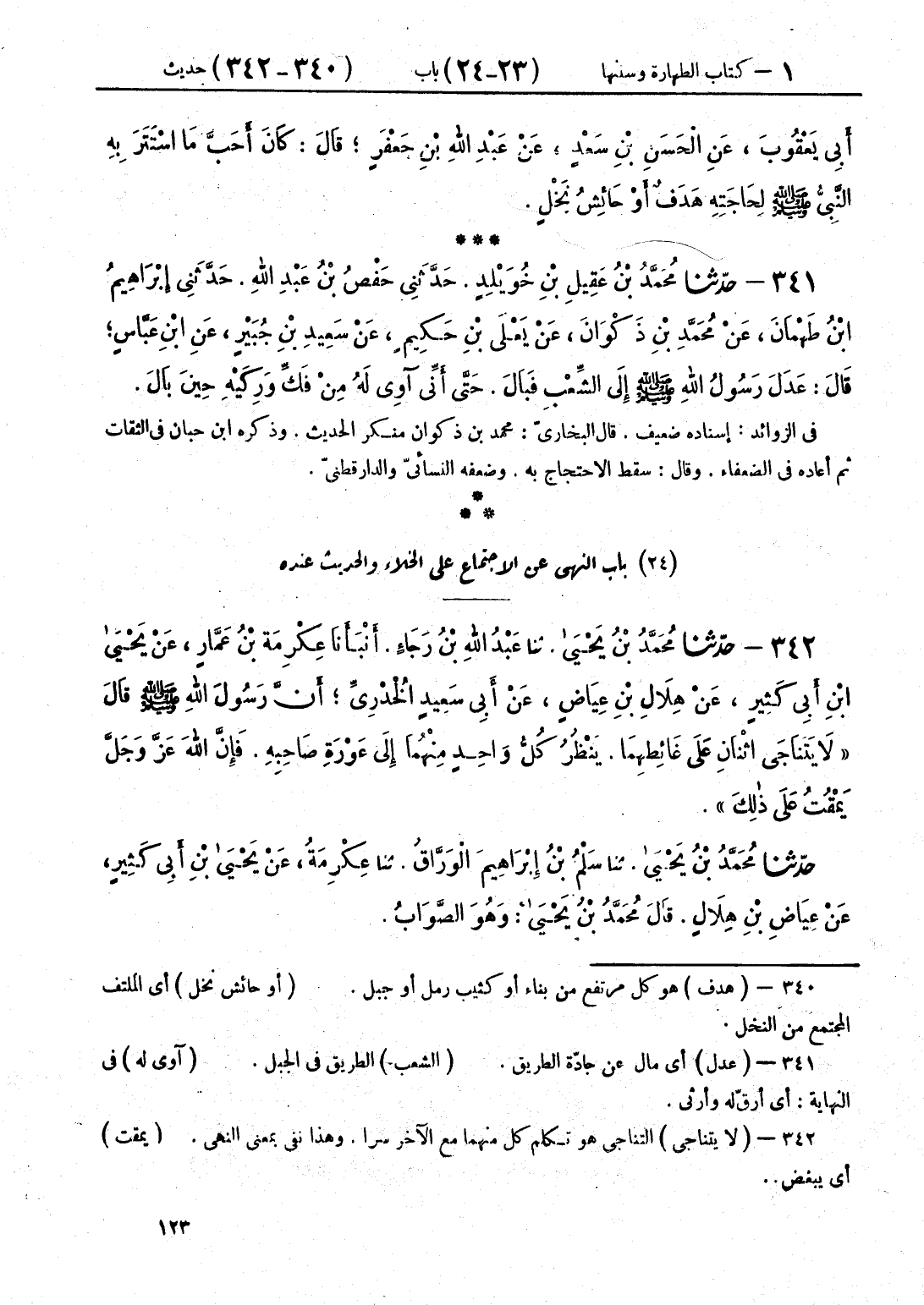 341 - حَدَّثَنَا مُحَمَّدُ بْنُ عَقِيلِ بْنِ خُوَيْلِدٍ قَالَ: حَدَّثَنِي حَفْصُ بْنُ عَبْدِ اللَّهِ قَالَ: حَدَّثَنِي إِبْرَاهِيمُ بْنُ طَهْمَانَ، عَنْ مُحَمَّدِ بْنِ ذَكْوَانَ، عَنْ يَعْلَى بْنِ حَكِيمٍ، عَنْ سَعِيدِ بْنِ جُبَيْرٍ، عَنِ ابْنِ عَبَّاسٍ قَالَ: «§عَدَلَ رَسُولُ اللَّهِ صَلَّى اللهُ عَلَيْهِ وَسَلَّمَ إِلَى الشِّعْبِ فَبَالَ، حَتَّى أَنِّي آوِي لَهُ مِنْ فَكِّ وَرِكَيْهِ حِينَ بَالَ»