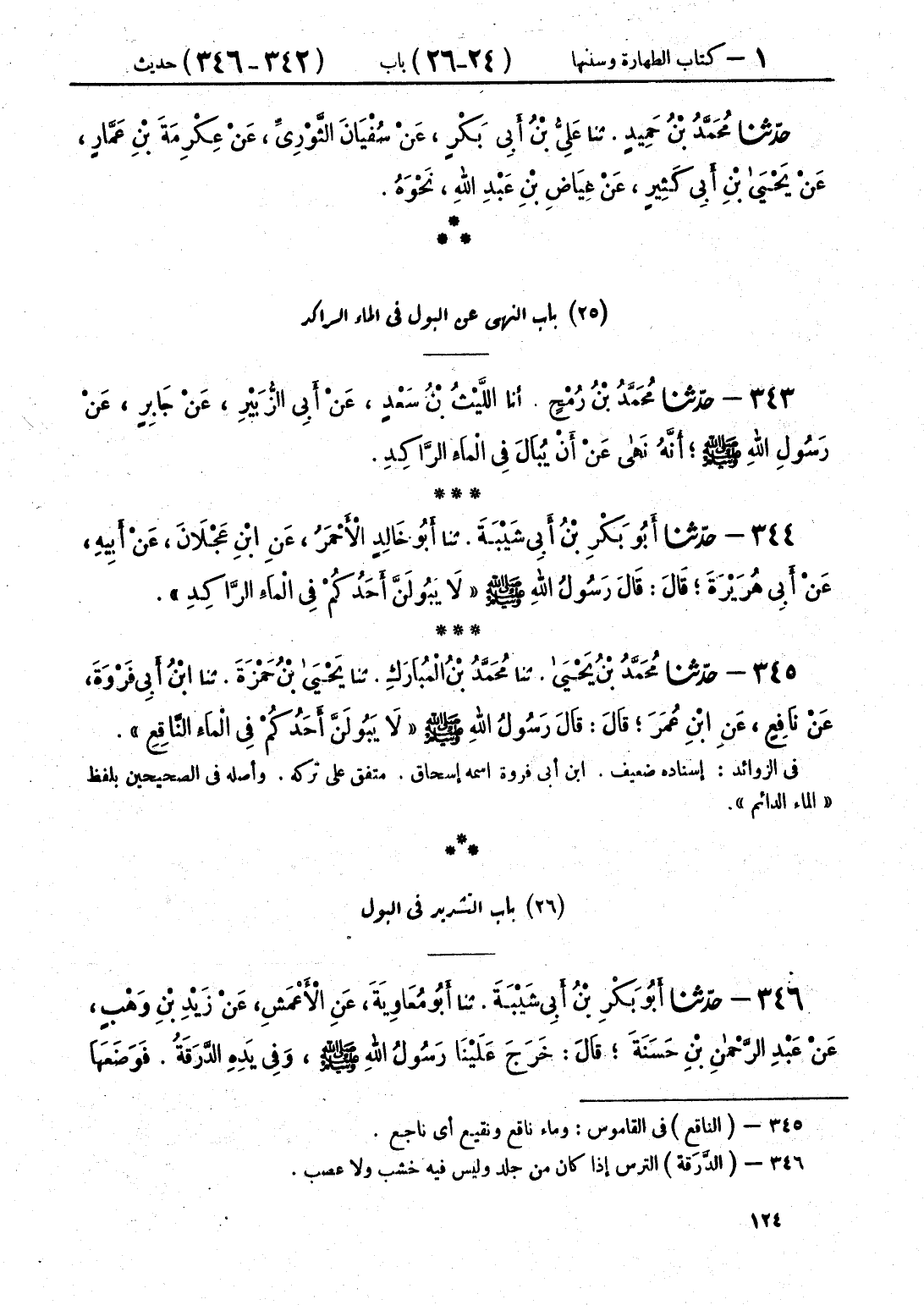 345 - حَدَّثَنَا مُحَمَّدُ بْنُ يَحْيَى قَالَ: حَدَّثَنَا مُحَمَّدُ بْنُ الْمُبَارَكِ قَالَ: حَدَّثَنَا يَحْيَى بْنُ حَمْزَةَ قَالَ: حَدَّثَنَا ابْنُ أَبِي فَرْوَةَ، عَنْ نَافِعٍ، عَنِ ابْنِ عُمَرَ قَالَ: قَالَ رَسُولُ اللَّهِ صَلَّى اللهُ عَلَيْهِ وَسَلَّمَ: «§لَا يَبُولَنَّ أَحَدُكُمْ فِي الْمَاءِ النَّاقِعِ»