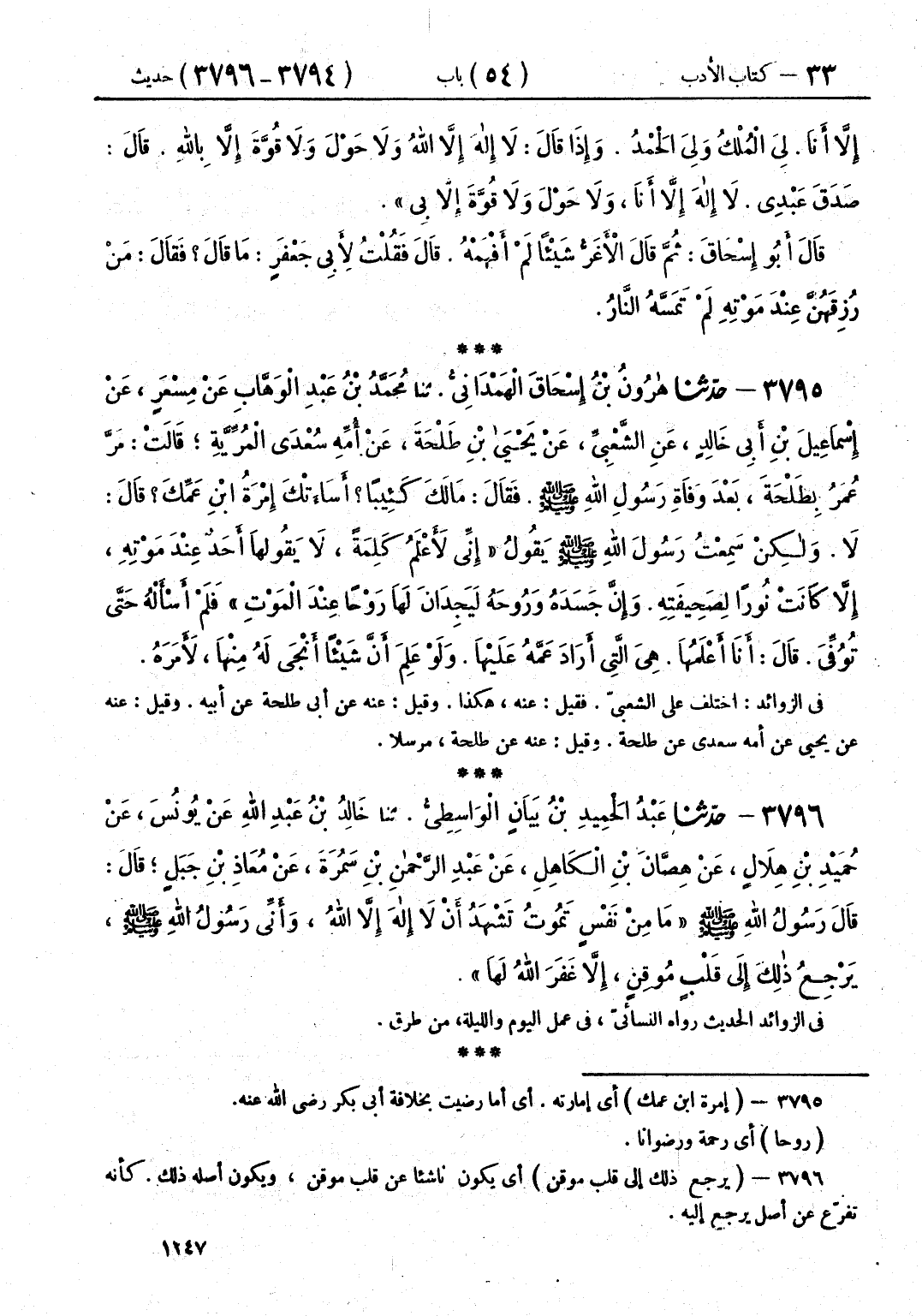 3795 - حَدَّثَنَا هَارُونُ بْنُ إِسْحَاقَ الْهَمْدَانِيُّ قَالَ: حَدَّثَنَا مُحَمَّدُ بْنُ عَبْدِ الْوَهَّابِ، عَنْ مِسْعَرٍ، عَنْ إِسْمَاعِيلَ بْنِ أَبِي خَالِدٍ، عَنِ الشَّعْبِيِّ، عَنْ يَحْيَى بْنِ طَلْحَةَ، عَنْ أُمِّهِ سُعْدَى الْمُرِّيَّةِ قَالَتْ: مَرَّ عُمَرُ بِطَلْحَةَ بَعْدَ وَفَاةِ رَسُولِ اللَّهِ صَلَّى اللهُ عَلَيْهِ وَسَلَّمَ، فَقَالَ: مَا لَكَ كَئِيبًا؟ أَسَاءَتْكَ إِمْرَةُ ابْنِ عَمِّكَ؟ قَالَ: لَا، وَلَكِنْ سَمِعْتُ رَسُولَ اللَّهِ صَلَّى اللهُ عَلَيْهِ وَسَلَّمَ يَقُولُ: «§إِنِّي لَأَعْلَمُ كَلِمَةً لَا يَقُولُهَا أَحَدٌ عِنْدَ مَوْتِهِ إِلَّا كَانَتْ نُورًا لِصَحِيفَتِهِ، وَإِنَّ جَسَدَهُ وَرُوحَهُ لَيَجِدَانِ لَهَا رَوْحًا عِنْدَ الْمَوْتِ» . فَلَمْ أَسْأَلْهُ حَتَّى تُوُفِّيَ، قَالَ: أَنَا أَعْلَمُهَا، هِيَ الَّتِي أَرَادَ عَمَّهُ عَلَيْهَا، وَلَوْ عَلِمَ أَنَّ شَيْئًا أَنْجَى لَهُ مِنْهَا، لَأَمَرَهُ "