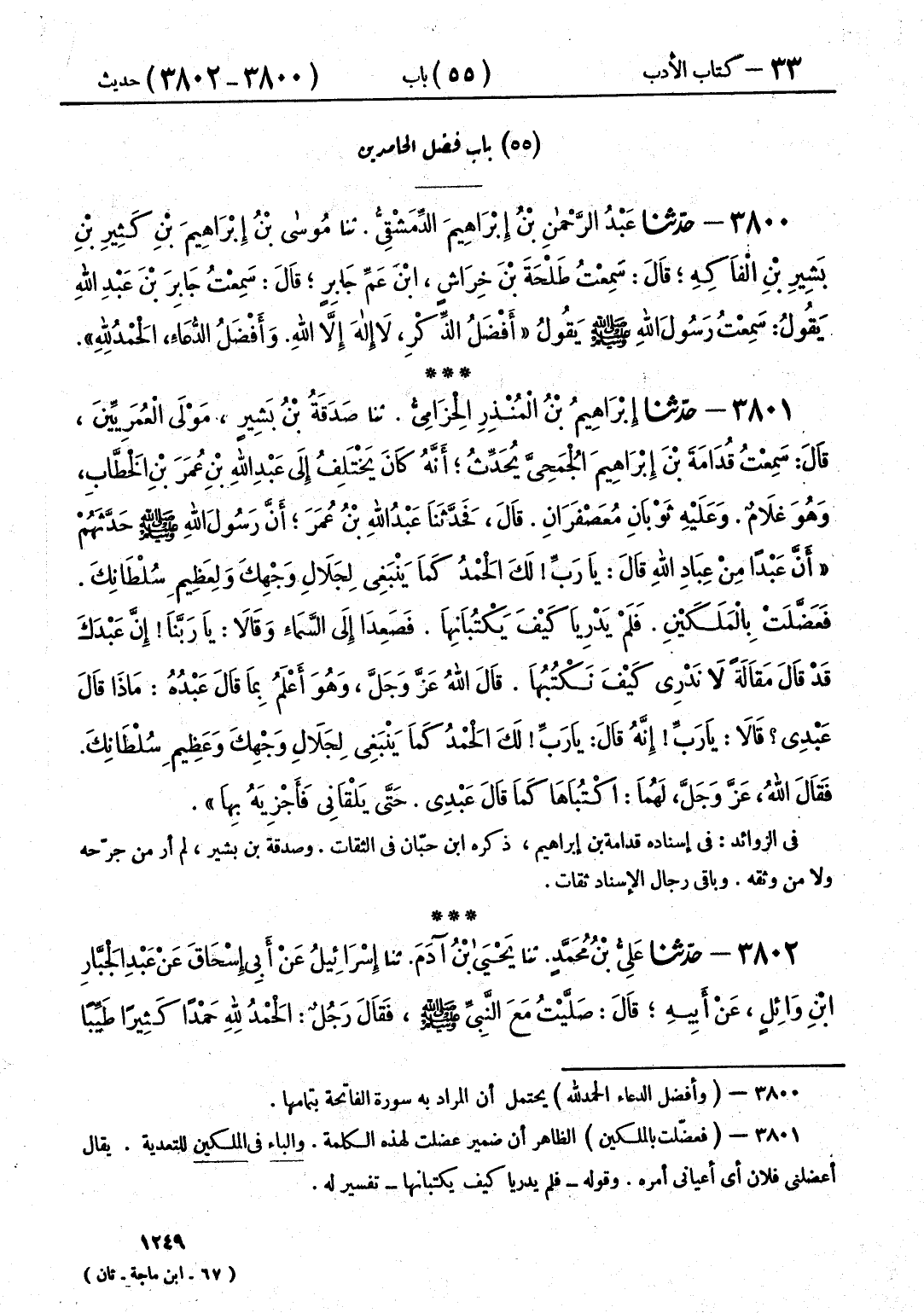 3800 - حَدَّثَنَا عَبْدُ الرَّحْمَنِ بْنُ إِبْرَاهِيمَ الدِّمَشْقِيُّ قَالَ: حَدَّثَنَا مُوسَى بْنُ إِبْرَاهِيمَ بْنِ كَثِيرِ بْنِ بَشِيرِ بْنِ الْفَاكِهِ قَالَ: سَمِعْتُ طَلْحَةَ بْنَ خِرَاشٍ ابْنَ عَمِّ، جَابِرٍ قَالَ: سَمِعْتُ جَابِرَ بْنَ عَبْدِ اللَّهِ يَقُولُ: سَمِعْتُ رَسُولَ اللَّهِ صَلَّى اللهُ عَلَيْهِ وَسَلَّمَ يَقُولُ: «§أَفْضَلُ الذِّكْرِ لَا إِلَهَ إِلَّا اللَّهُ، وَأَفْضَلُ الدُّعَاءِ الْحَمْدُ لِلَّهِ»