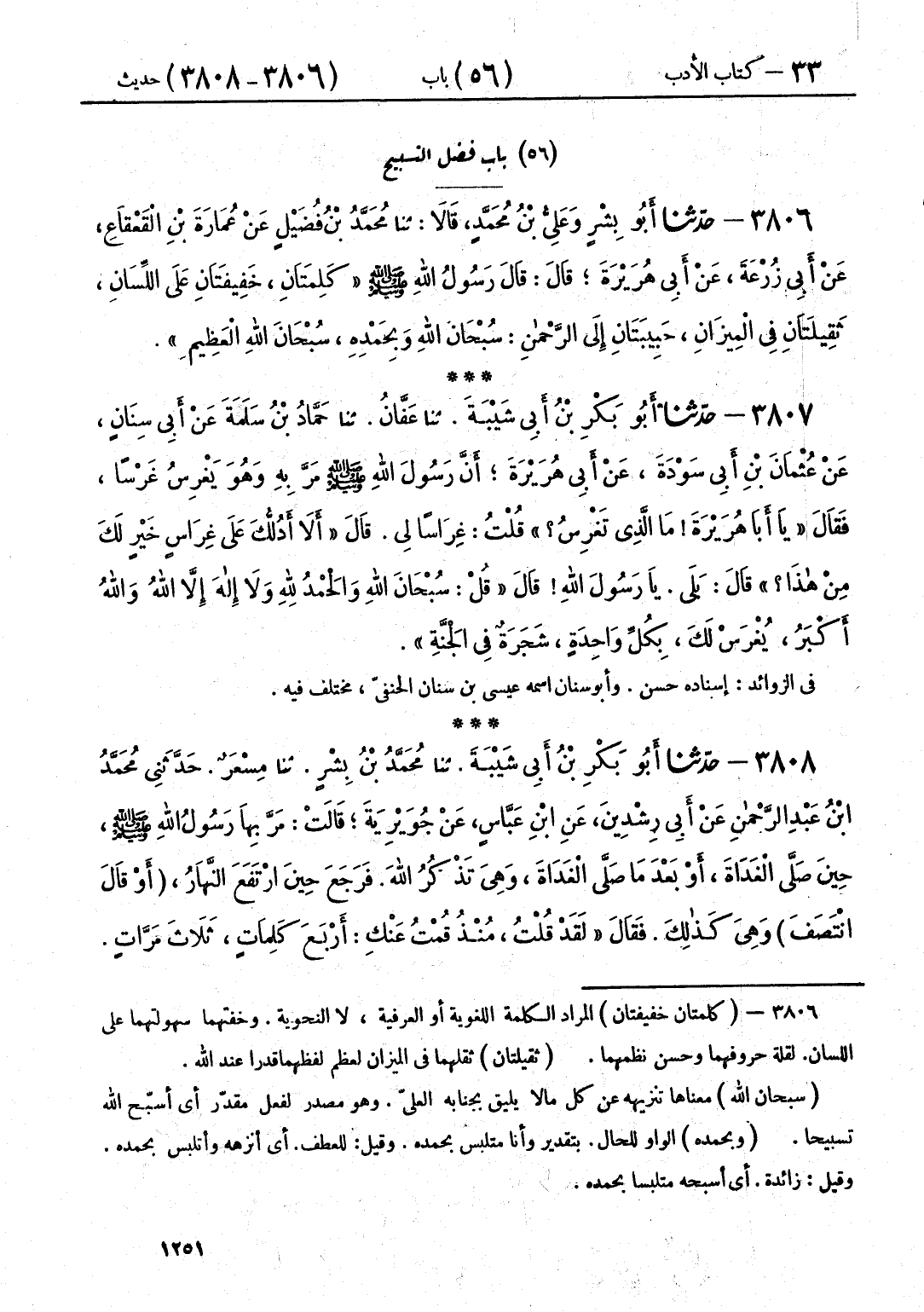 3806 - حَدَّثَنَا أَبُو بَكْرٍ، وَعَلِيُّ بْنُ مُحَمَّدٍ قَالَا: حَدَّثَنَا مُحَمَّدُ بْنُ فُضَيْلٍ، عَنْ عُمَارَةَ بْنِ الْقَعْقَاعِ، عَنْ أَبِي زُرْعَةَ، عَنْ أَبِي هُرَيْرَةَ قَالَ: قَالَ رَسُولُ اللَّهِ صَلَّى اللهُ عَلَيْهِ وَسَلَّمَ: «§كَلِمَتَانِ خَفِيفَتَانِ عَلَى اللِّسَانِ، ثَقِيلَتَانِ فِي الْمِيزَانِ، حَبِيبَتَانِ إِلَى الرَّحْمَنِ، سُبْحَانَ اللَّهِ وَبِحَمْدِهِ، سُبْحَانَ اللَّهِ الْعَظِيمِ»