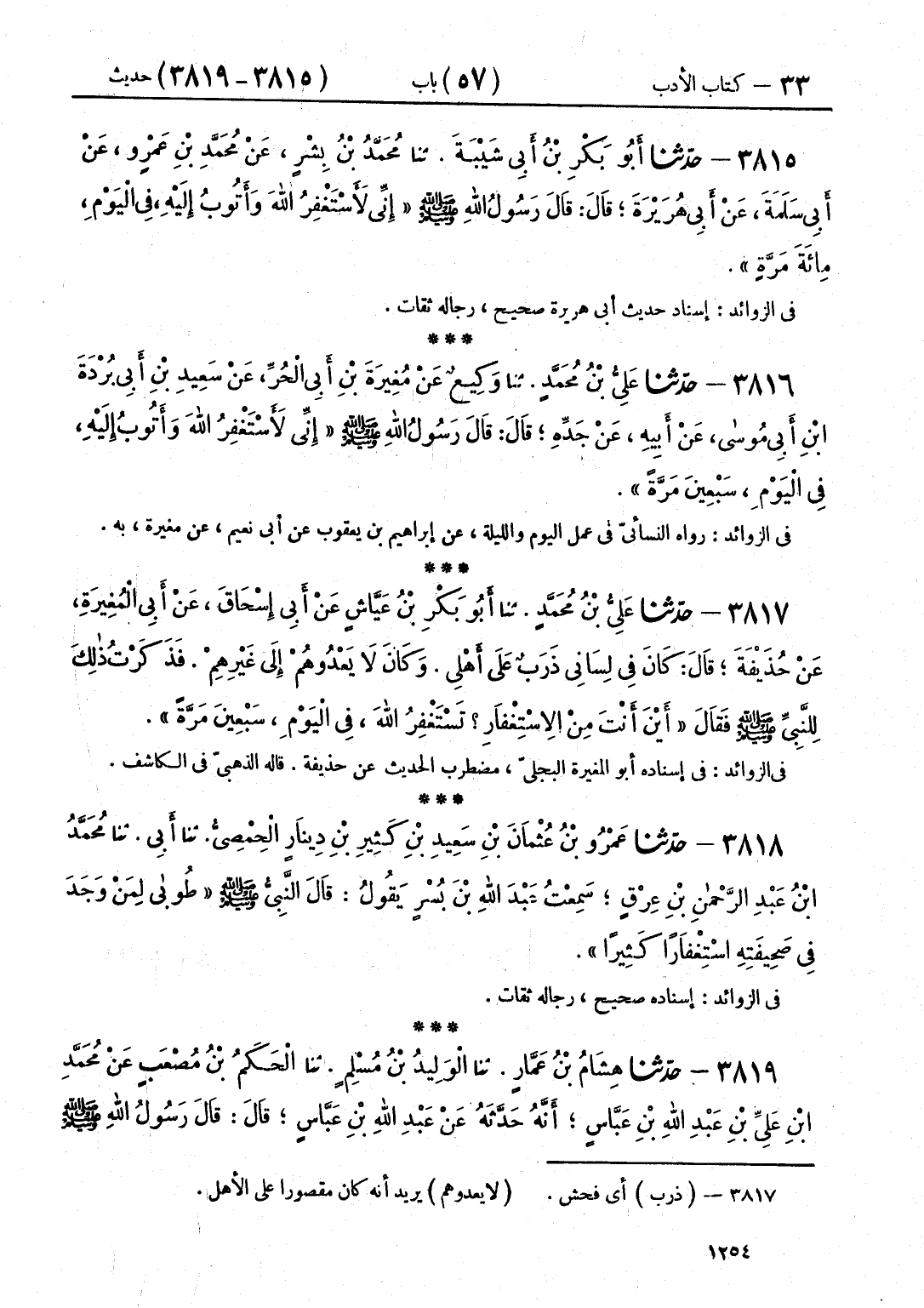 3815 - حَدَّثَنَا أَبُو بَكْرِ بْنُ أَبِي شَيْبَةَ قَالَ: حَدَّثَنَا مُحَمَّدُ بْنُ بِشْرٍ، عَنْ مُحَمَّدِ بْنِ عَمْرٍو، عَنْ أَبِي سَلَمَةَ، عَنْ أَبِي هُرَيْرَةَ قَالَ: قَالَ رَسُولُ اللَّهِ صَلَّى اللهُ عَلَيْهِ وَسَلَّمَ: «§إِنِّي لَأَسْتَغْفِرُ اللَّهَ وَأَتُوبُ إِلَيْهِ فِي الْيَوْمِ مِائَةَ مَرَّةٍ»