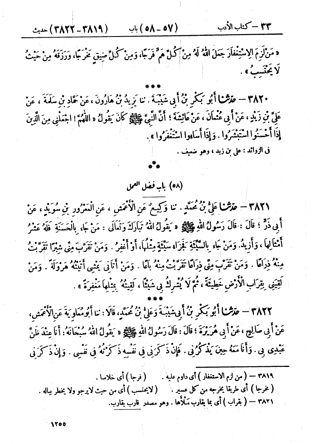 3820 - حَدَّثَنَا أَبُو بَكْرِ بْنُ أَبِي شَيْبَةَ قَالَ: حَدَّثَنَا يَزِيدُ بْنُ هَارُونَ، عَنْ حَمَّادِ بْنِ سَلَمَةَ، عَنْ عَلِيِّ بْنِ زَيْدٍ، عَنْ أَبِي عُثْمَانَ، عَنْ عَائِشَةَ، أَنَّ النَّبِيَّ صَلَّى اللهُ عَلَيْهِ وَسَلَّمَ كَانَ يَقُولُ: «§اللَّهُمَّ اجْعَلْنِي مِنَ الَّذِينَ إِذَا أَحْسَنُوا اسْتَبْشَرُوا، وَإِذَا أَسَاءُوا اسْتَغْفَرُوا»