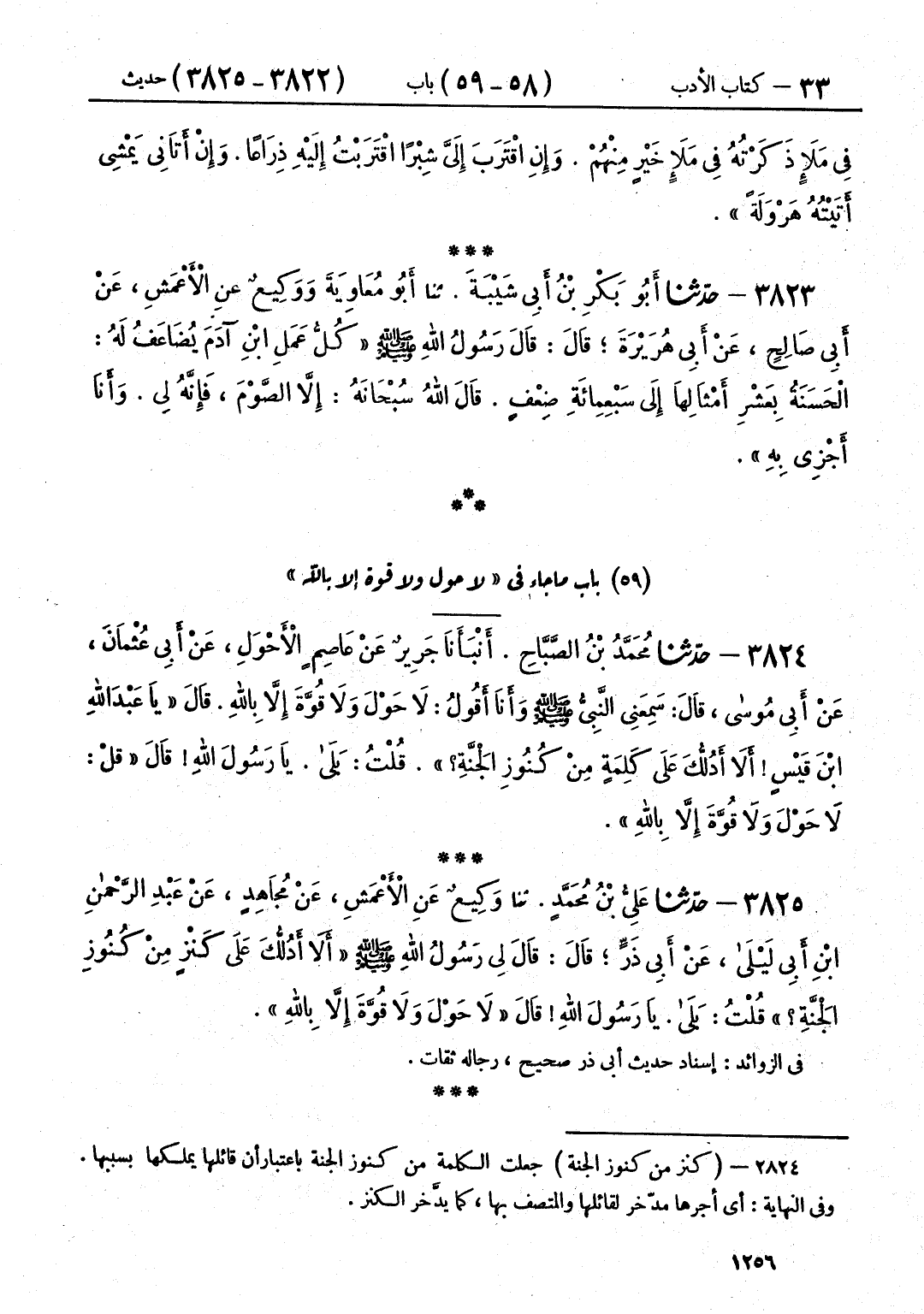 3824 - حَدَّثَنَا مُحَمَّدُ بْنُ الصَّبَّاحِ قَالَ: أَنْبَأَنَا جَرِيرٌ، عَنْ عَاصِمٍ الْأَحْوَلِ، عَنْ أَبِي عُثْمَانَ، عَنْ أَبِي مُوسَى قَالَ: سَمِعَنِي النَّبِيُّ صَلَّى اللهُ عَلَيْهِ وَسَلَّمَ وَأَنَا أَقُولُ: لَا حَوْلَ وَلَا قُوَّةَ إِلَّا بِاللَّهِ، قَالَ: «يَا عَبْدَ اللَّهِ بْنَ قَيْسٍ أَلَا أَدُلُّكَ عَلَى كَلِمَةٍ مِنْ كُنُوزِ الْجَنَّةِ؟» ، قُلْتُ: بَلَى يَا رَسُولَ اللَّهِ، قَالَ: §قُلْ: «لَا حَوْلَ وَلَا قُوَّةَ إِلَّا بِاللَّهِ»