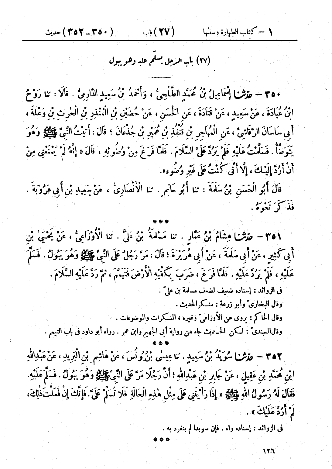 352 - حَدَّثَنَا سُوَيْدُ بْنُ سَعِيدٍ قَالَ: حَدَّثَنَا عِيسَى بْنُ يُونُسَ، عَنْ هَاشِمِ بْنِ الْبَرِيدِ، عَنْ عَبْدِ اللَّهِ بْنِ مُحَمَّدِ بْنِ عَقِيلٍ، عَنْ جَابِرِ بْنِ عَبْدِ اللَّهِ أَنَّ رَجُلًا مَرَّ عَلَى النَّبِيِّ صَلَّى اللهُ عَلَيْهِ وَسَلَّمَ وَهُوَ يَبُولُ، فَسَلَّمَ عَلَيْهِ، فَقَالَ لَهُ رَسُولُ اللَّهِ صَلَّى اللهُ عَلَيْهِ وَسَلَّمَ: «§إِذَا رَأَيْتَنِي عَلَى مِثْلِ هَذِهِ الْحَالَةِ، فَلَا تُسَلِّمْ عَلَيَّ، فَإِنَّكَ إِنْ فَعَلْتَ ذَلِكَ لَمْ أَرُدَّ عَلَيْكَ»