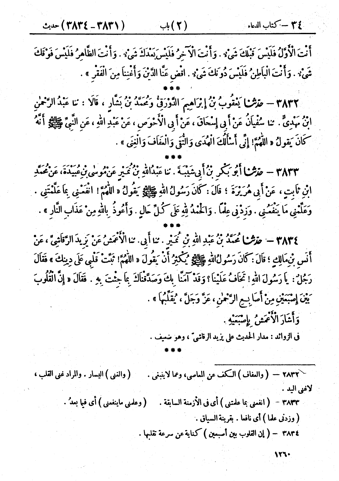 3834 - حَدَّثَنَا مُحَمَّدُ بْنُ عَبْدِ اللَّهِ بْنِ نُمَيْرٍ قَالَ: حَدَّثَنَا أَبِي قَالَ: حَدَّثَنَا الْأَعْمَشُ، عَنْ يَزِيدَ الرَّقَاشِيِّ، عَنْ أَنَسِ بْنِ مَالِكٍ قَالَ: كَانَ رَسُولُ اللَّهِ صَلَّى اللهُ عَلَيْهِ وَسَلَّمَ يُكْثِرُ أَنْ يَقُولَ: «§اللَّهُمَّ ثَبِّتْ قَلْبِي عَلَى دِينِكَ» ، فَقَالَ رَجُلٌ: يَا رَسُولَ اللَّهِ، تَخَافُ عَلَيْنَا وَقَدْ آمَنَّا بِكَ، وَصَدَّقْنَاكَ بِمَا جِئْتَ بِهِ، فَقَالَ: «إِنَّ الْقُلُوبَ بَيْنَ إِصْبَعَيْنِ مِنْ أَصَابِعِ الرَّحْمَنِ عَزَّ وَجَلَّ يُقَلِّبُهَا» وَأَشَارَ الْأَعْمَشُ بِإِصْبَعَيْهِ