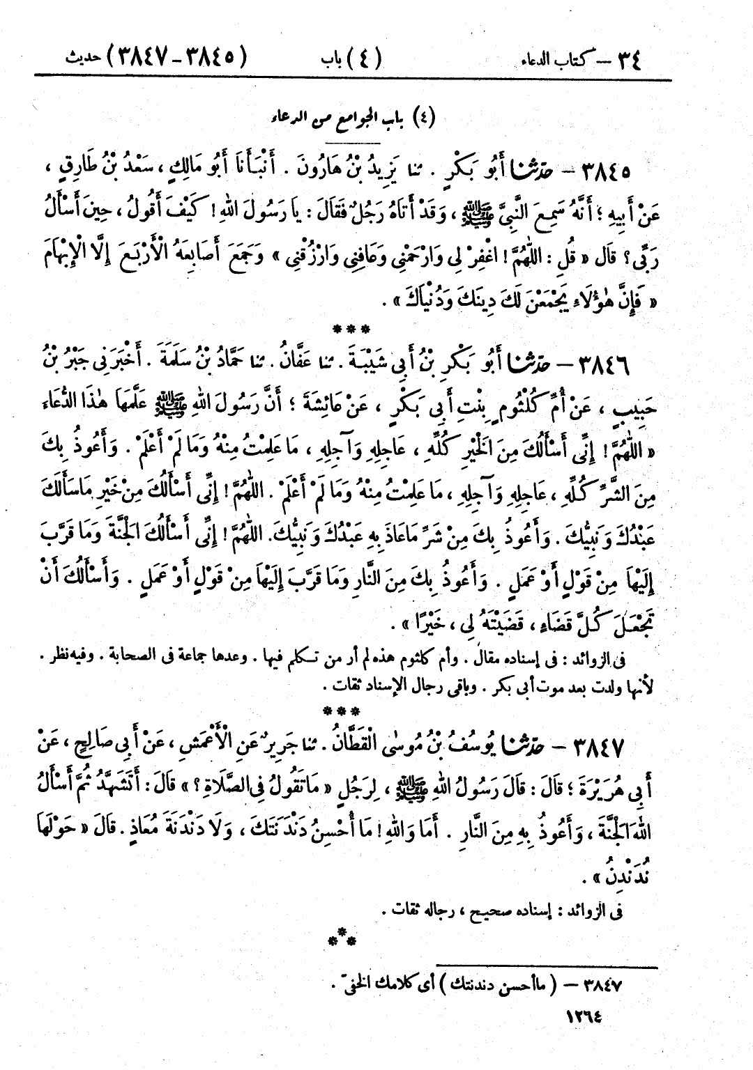3846 - حَدَّثَنَا أَبُو بَكْرِ بْنُ أَبِي شَيْبَةَ قَالَ: حَدَّثَنَا عَفَّانُ قَالَ: حَدَّثَنَا حَمَّادُ بْنُ سَلَمَةَ قَالَ: أَخْبَرَنِي جَبْرُ بْنُ حَبِيبٍ، عَنْ أُمِّ كُلْثُومٍ بِنْتِ أَبِي بَكْرٍ، عَنْ عَائِشَةَ، أَنَّ رَسُولَ اللَّهِ صَلَّى اللهُ عَلَيْهِ وَسَلَّمَ عَلَّمَهَا هَذَا الدُّعَاءَ: «§اللَّهُمَّ إِنِّي أَسْأَلُكَ مِنَ الْخَيْرِ كُلِّهِ عَاجِلِهِ وَآجِلِهِ، مَا عَلِمْتُ مِنْهُ وَمَا لَمْ أَعْلَمْ، وَأَعُوذُ بِكَ مِنَ الشَّرِّ كُلِّهِ عَاجِلِهِ وَآجِلِهِ، مَا عَلِمْتُ مِنْهُ وَمَا لَمْ أَعْلَمْ، اللَّهُمَّ إِنِّي أَسْأَلُكَ مِنْ خَيْرِ مَا سَأَلَكَ عَبْدُكَ وَنَبِيُّكَ، وَأَعُوذُ بِكَ مِنْ شَرِّ مَا عَاذَ بِهِ عَبْدُكَ وَنَبِيُّكَ، اللَّهُمَّ إِنِّي أَسْأَلُكَ الْجَنَّةَ وَمَا قَرَّبَ إِلَيْهَا مِنْ قَوْلٍ أَوْ عَمَلٍ، وَأَعُوذُ بِكَ مِنَ النَّارِ وَمَا قَرَّبَ إِلَيْهَا مِنْ قَوْلٍ أَوْ عَمَلٍ، وَأَسْأَلُكَ أَنْ تَجْعَلَ كُلَّ قَضَاءٍ قَضَيْتَهُ لِي خَيْرًا»