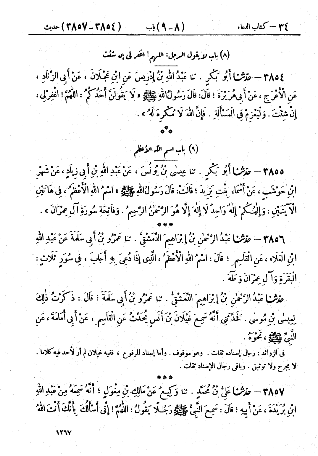 3854 - حَدَّثَنَا أَبُو بَكْرٍ قَالَ: حَدَّثَنَا عَبْدُ اللَّهِ بْنُ إِدْرِيسَ، عَنِ ابْنِ عَجْلَانَ، عَنْ أَبِي الزِّنَادِ، عَنِ الْأَعْرَجِ، عَنْ أَبِي هُرَيْرَةَ قَالَ: قَالَ رَسُولُ اللَّهِ صَلَّى اللهُ عَلَيْهِ وَسَلَّمَ: " §لَا يَقُولَنَّ أَحَدُكُمْ: اللَّهُمَّ اغْفِرْ لِي إِنْ شِئْتَ، وَلْيَعْزِمْ فِي الْمَسْأَلَةِ، فَإِنَّ اللَّهَ لَا مُكْرِهَ لَهُ "