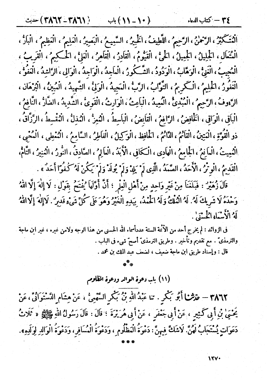 3862 - حَدَّثَنَا أَبُو بَكْرٍ قَالَ: حَدَّثَنَا عَبْدُ اللَّهِ بْنُ بَكْرٍ السَّهْمِيُّ، عَنْ هِشَامٍ الدَّسْتُوَائِيِّ، عَنْ يَحْيَى بْنِ أَبِي كَثِيرٍ، عَنْ أَبِي جَعْفَرٍ، عَنْ أَبِي هُرَيْرَةَ قَالَ: قَالَ رَسُولُ اللَّهِ صَلَّى اللهُ عَلَيْهِ وَسَلَّمَ: " §ثَلَاثُ دَعَوَاتٍ يُسْتَجَابُ لَهُنَّ، لَا شَكَّ فِيهِنَّ: دَعْوَةُ الْمَظْلُومِ، وَدَعْوَةُ الْمُسَافِرِ، وَدَعْوَةُ الْوَالِدِ لِوَلَدِهِ "
