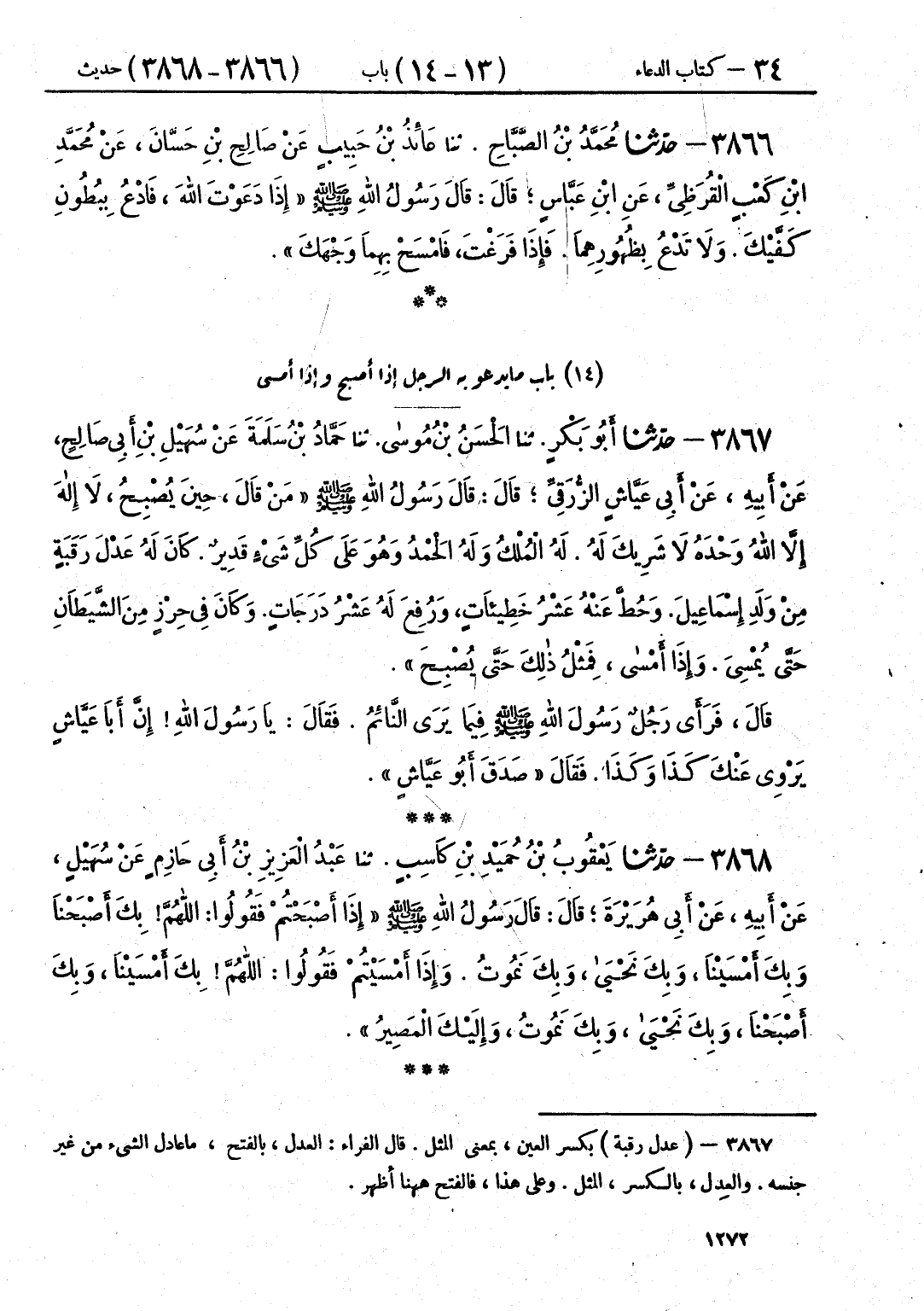 3867 - حَدَّثَنَا أَبُو بَكْرٍ قَالَ: حَدَّثَنَا الْحَسَنُ بْنُ مُوسَى قَالَ: حَدَّثَنَا حَمَّادُ بْنُ سَلَمَةَ، عَنْ سُهَيْلِ بْنِ أَبِي صَالِحٍ، عَنْ أَبِيهِ، عَنْ أَبِي عَيَّاشٍ الزُّرَقِيِّ قَالَ: قَالَ رَسُولُ اللَّهِ صَلَّى اللهُ عَلَيْهِ وَسَلَّمَ: «§مَنْ قَالَ حِينَ يُصْبِحُ لَا إِلَهَ إِلَّا اللَّهُ وَحْدَهُ لَا شَرِيكَ لَهُ، لَهُ الْمُلْكُ، وَلَهُ الْحَمْدُ، وَهُوَ عَلَى كُلِّ شَيْءٍ قَدِيرٌ، كَانَ لَهُ عَدْلَ رَقَبَةٍ مِنْ وَلَدِ إِسْمَاعِيلَ، وَحُطَّ عَنْهُ عَشْرُ خَطِيئَاتٍ، وَرُفِعَ لَهُ عَشْرُ دَرَجَاتٍ، وَكَانَ فِي حِرْزٍ مِنَ الشَّيْطَانِ حَتَّى يُمْسِيَ، وَإِذَا أَمْسَى فَمِثْلُ ذَلِكَ حَتَّى يُصْبِحَ» قَالَ: فَرَأَى رَجُلٌ رَسُولَ اللَّهِ صَلَّى اللهُ عَلَيْهِ وَسَلَّمَ فِيمَا يَرَى النَّائِمُ، فَقَالَ: يَا رَسُولَ اللَّهِ، إِنَّ أَبَا عَيَّاشٍ يَرْوِي عَنْكَ كَذَا وَكَذَا، فَقَالَ: «صَدَقَ أَبُو عَيَّاشٍ»