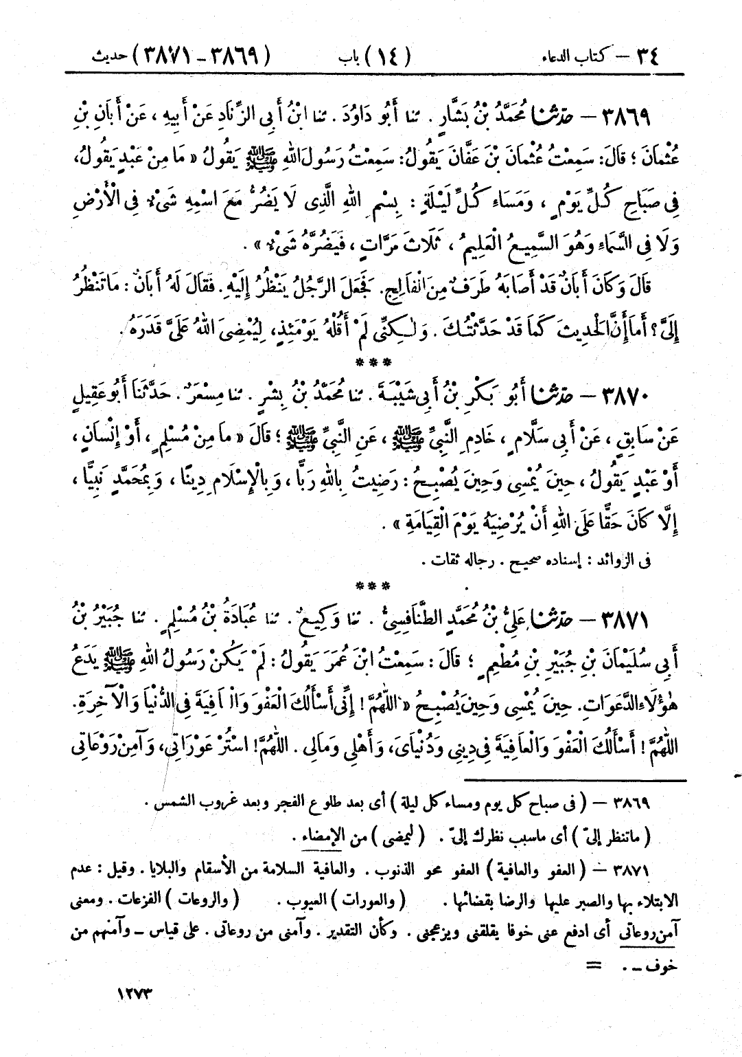 3869 - حَدَّثَنَا مُحَمَّدُ بْنُ بَشَّارٍ قَالَ: حَدَّثَنَا أَبُو دَاوُدَ قَالَ: حَدَّثَنَا ابْنُ أَبِي الزِّنَادِ، عَنْ أَبِيهِ، عَنْ أَبَانَ بْنِ عُثْمَانَ قَالَ: سَمِعْتُ عُثْمَانَ بْنَ عَفَّانَ يَقُولُ: سَمِعْتُ رَسُولَ اللَّهِ صَلَّى اللهُ عَلَيْهِ وَسَلَّمَ يَقُولُ: " §مَا مِنْ عَبْدٍ يَقُولُ فِي صَبَاحِ كُلِّ يَوْمٍ، وَمَسَاءِ كُلِّ لَيْلَةٍ: بِسْمِ اللَّهِ الَّذِي لَا يَضُرُّ مَعَ اسْمِهِ شَيْءٌ فِي الْأَرْضِ وَلَا فِي السَّمَاءِ، وَهُوَ السَّمِيعُ الْعَلِيمُ، ثَلَاثَ مَرَّاتٍ، فَيَضُرَّهُ شَيْءٌ " قَالَ: وَكَانَ أَبَانُ قَدْ أَصَابَهُ طَرَفٌ مِنَ الْفَالِجِ، فَجَعَلَ الرَّجُلُ يَنْظُرُ إِلَيْهِ، فَقَالَ لَهُ أَبَانُ: «مَا تَنْظُرُ إِلَيَّ؟ أَمَا إِنَّ الْحَدِيثَ كَمَا قَدْ حَدَّثْتُكَ، وَلَكِنِّي لَمْ أَقُلْهُ يَوْمَئِذٍ، لِيُمْضِيَ اللَّهُ عَلَيَّ قَدَرَهُ»