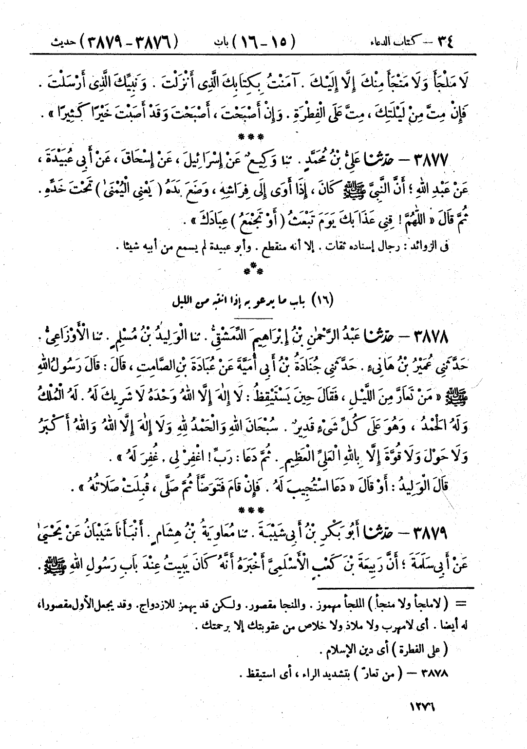 3877 - حَدَّثَنَا عَلِيُّ بْنُ مُحَمَّدٍ قَالَ: حَدَّثَنَا وَكِيعٌ، عَنْ إِسْرَائِيلَ، عَنْ أَبِي إِسْحَاقَ، عَنْ أَبِي عُبَيْدَةَ، عَنْ عَبْدِ اللَّهِ، أَنَّ النَّبِيَّ صَلَّى اللهُ عَلَيْهِ وَسَلَّمَ كَانَ إِذَا أَوَى إِلَى فِرَاشِهِ وَضَعَ يَدَهُ - يَعْنِي الْيُمْنَى - تَحْتَ خَدِّهِ، ثُمَّ قَالَ: «§قِنِي عَذَابَكَ يَوْمَ تَبْعَثُ - أَوْ تَجْمَعُ عِبَادَكَ -»
