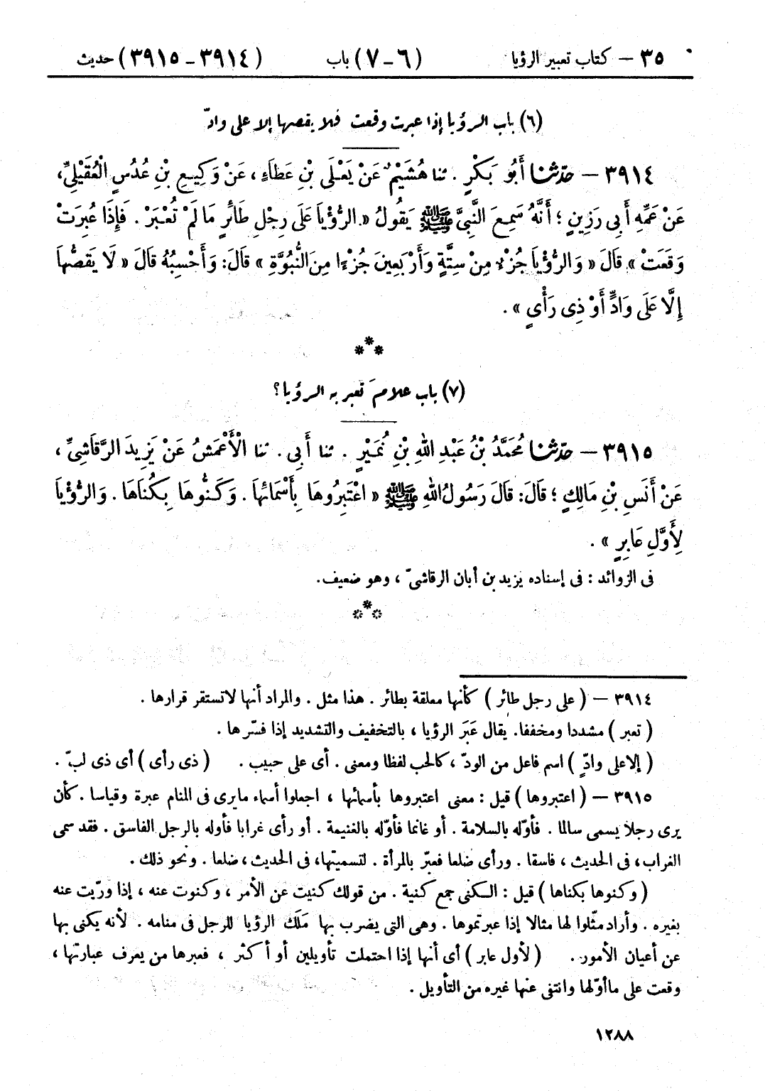3915 - حَدَّثَنَا مُحَمَّدُ بْنُ عَبْدِ اللَّهِ بْنِ نُمَيْرٍ قَالَ: حَدَّثَنَا أَبِي قَالَ: حَدَّثَنَا الْأَعْمَشُ، عَنْ يَزِيدَ الرَّقَاشِيِّ، عَنْ أَنَسِ بْنِ مَالِكٍ، قَالَ: قَالَ رَسُولُ اللَّهِ صَلَّى اللهُ عَلَيْهِ وَسَلَّمَ: «§اعْتَبِرُوهَا بِأَسْمَائِهَا، وَكَنُّوهَا بِكُنَاهَا، وَالرُّؤْيَا لِأَوَّلِ عَابِرٍ»