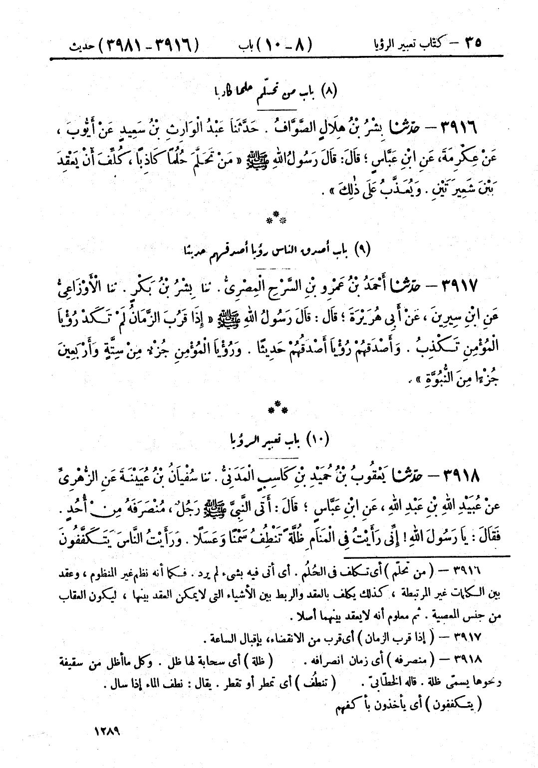 3916 - حَدَّثَنَا بِشْرُ بْنُ هِلَالٍ الصَّوَّافُ قَالَ: حَدَّثَنَا عَبْدُ الْوَارِثِ بْنُ سَعِيدٍ، عَنْ أَيُّوبَ، عَنْ عِكْرِمَةَ، عَنِ ابْنِ عَبَّاسٍ، قَالَ: قَالَ رَسُولُ اللَّهِ صَلَّى اللهُ عَلَيْهِ وَسَلَّمَ: «§مَنْ تَحَلَّمَ حُلُمًا كَاذِبًا، كُلِّفَ أَنْ يَعْقِدَ بَيْنَ شَعِيرَتَيْنِ، وَيُعَذَّبُ عَلَى ذَلِكَ»