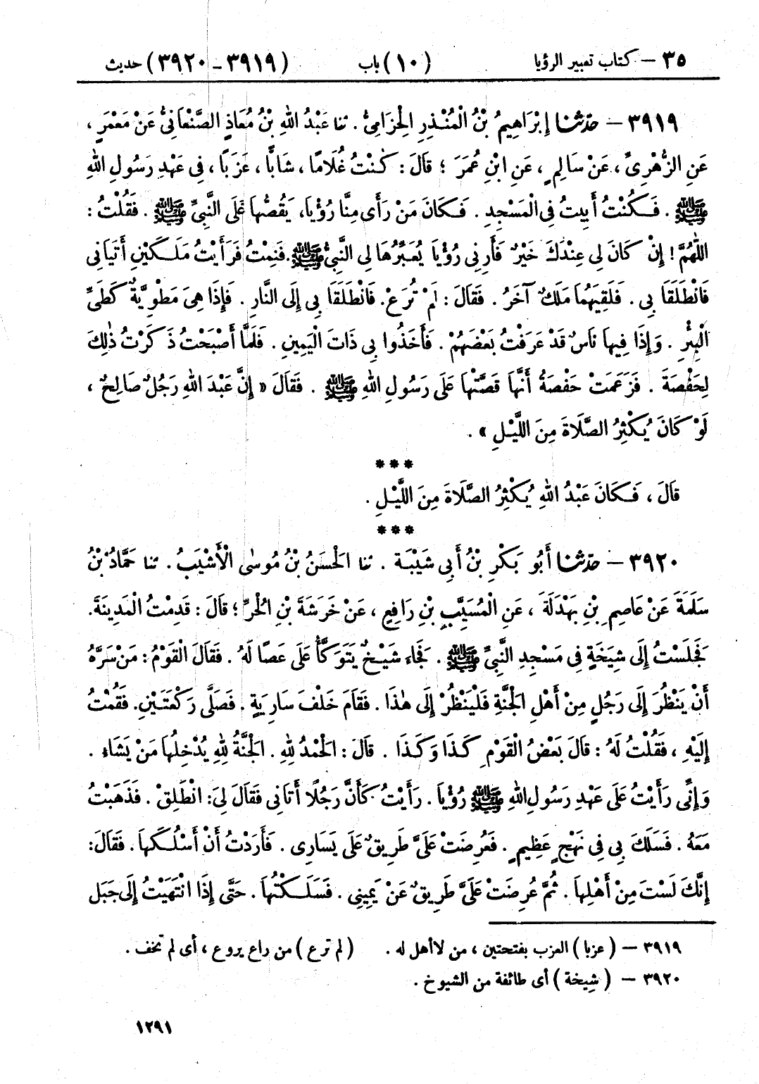 3919 - حَدَّثَنَا إِبْرَاهِيمُ بْنُ الْمُنْذِرِ الْحِزَامِيُّ قَالَ: حَدَّثَنَا عَبْدُ اللَّهِ بْنُ مُعَاذٍ الصَّنْعَانِيُّ، عَنْ مَعْمَرٍ، عَنِ الزُّهْرِيِّ، عَنْ سَالِمٍ، عَنِ ابْنِ عُمَرَ، قَالَ: كُنْتُ غُلَامًا شَابًّا عَزَبًا، فِي عَهْدِ رَسُولِ اللَّهِ صَلَّى اللهُ عَلَيْهِ وَسَلَّمَ، فَكُنْتُ أَبِيتُ فِي الْمَسْجِدِ، فَكَانَ مَنْ رَأَى مِنَّا رُؤْيَا، يَقُصُّهَا عَلَى النَّبِيِّ صَلَّى اللهُ عَلَيْهِ وَسَلَّمَ، فَقُلْتُ: اللَّهُمَّ إِنْ كَانَ لِي عِنْدَكَ خَيْرٌ فَأَرِنِي رُؤْيَا يُعَبِّرُهَا لِي النَّبِيُّ صَلَّى اللهُ عَلَيْهِ وَسَلَّمَ، فَنِمْتُ، §فَرَأَيْتُ مَلَكَيْنِ أَتَيَانِي فَانْطَلَقَا بِي، فَلَقِيَهُمَا مَلَكٌ آخَرُ، فَقَالَ: لَمْ تُرَعْ، فَانْطَلَقَا بِي إِلَى النَّارِ، فَإِذَا هِيَ مَطْوِيَّةٌ كَطَيِّ الْبِئْرِ، وَإِذَا فِيهَا نَاسٌ قَدْ عَرَفْتُ بَعْضَهُمْ، فَأَخَذُوا بِي ذَاتَ الْيَمِينِ، فَلَمَّا أَصْبَحْتُ ذَكَرْتُ ذَلِكَ لِحَفْصَةَ، فَزَعَمَتْ حَفْصَةُ، أَنَّهَا قَصَّتْهَا عَلَى رَسُولِ اللَّهِ صَلَّى اللهُ عَلَيْهِ وَسَلَّمَ، فَقَالَ: «إِنَّ عَبْدَ اللَّهِ رَجُلٌ صَالِحٌ، لَوْ كَانَ يُكْثِرُ الصَّلَاةَ مِنَ اللَّيْلِ» قَالَ: «فَكَانَ عَبْدُ اللَّهِ يُكْثِرُ الصَّلَاةَ مِنَ اللَّيْلِ»