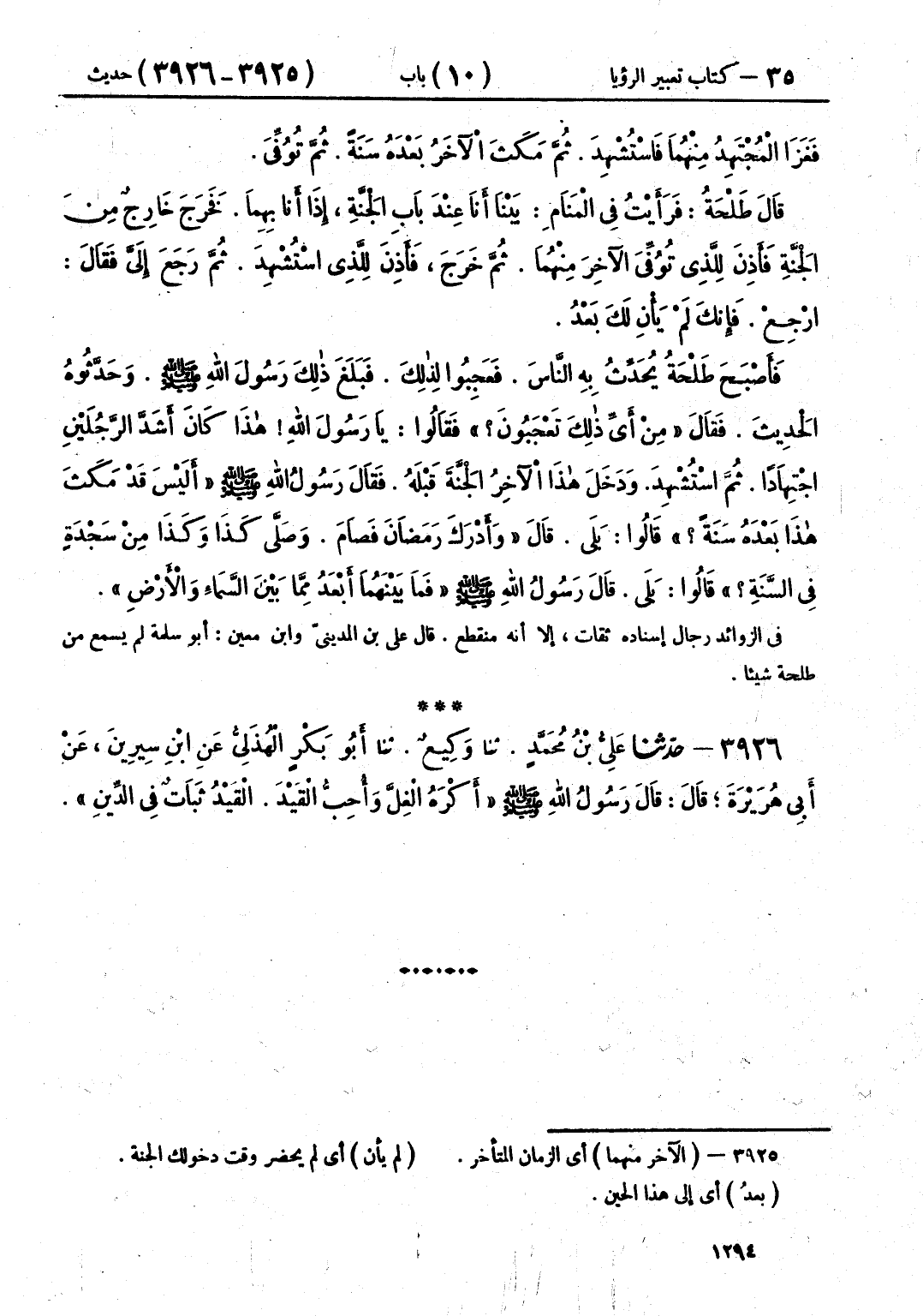 3926 - حَدَّثَنَا عَلِيُّ بْنُ مُحَمَّدٍ قَالَ: حَدَّثَنَا وَكِيعٌ قَالَ: حَدَّثَنَا أَبُو بَكْرٍ الْهُذَلِيُّ، عَنِ ابْنِ سِيرِينَ، عَنْ أَبِي هُرَيْرَةَ، قَالَ: قَالَ رَسُولُ اللَّهِ صَلَّى اللهُ عَلَيْهِ وَسَلَّمَ: «§أَكْرَهُ الْغِلَّ، وَأُحِبُّ الْقَيْدَ، الْقَيْدُ ثَبَاتٌ فِي الدِّينِ»