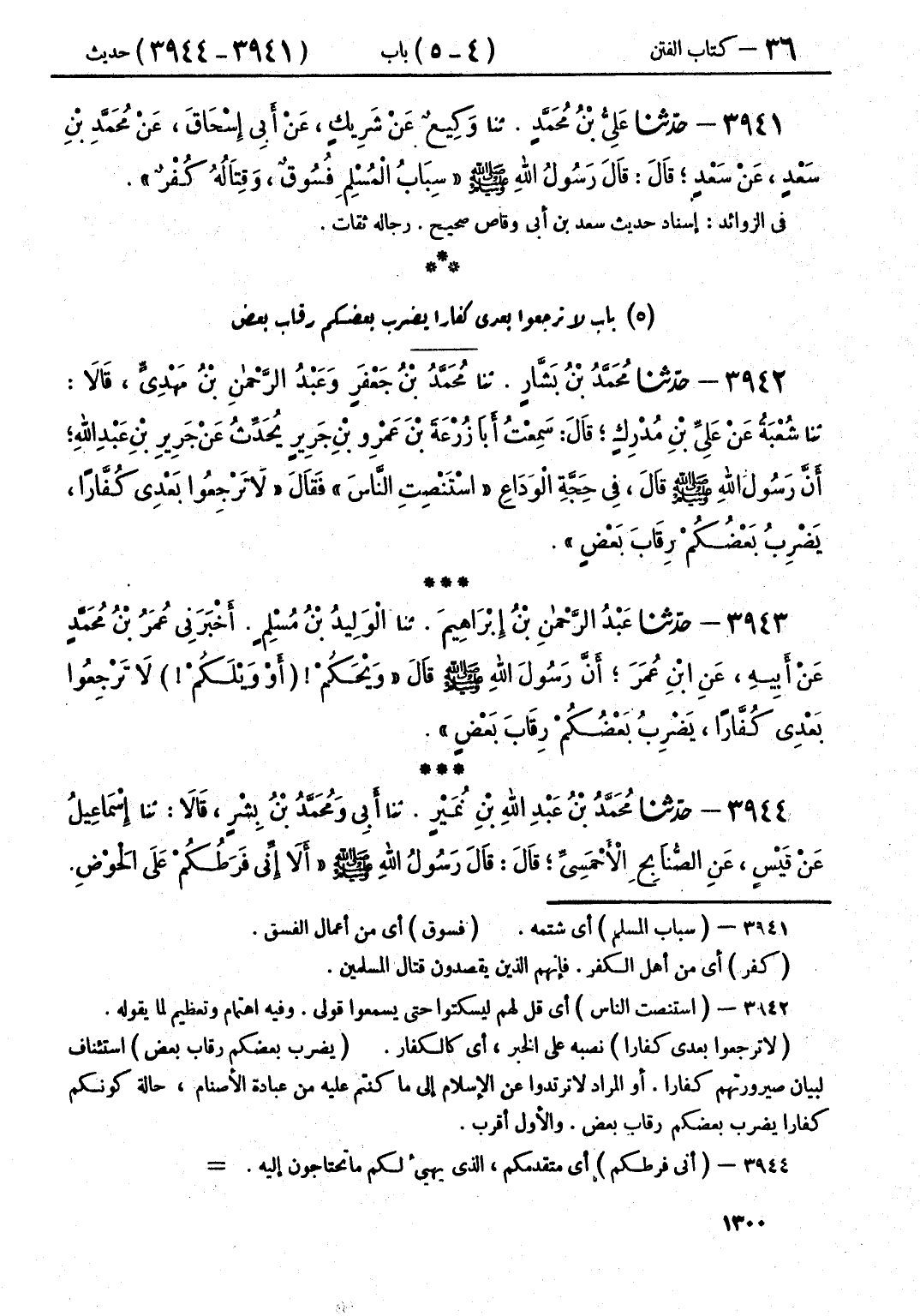 3942 - حَدَّثَنَا مُحَمَّدُ بْنُ بَشَّارٍ قَالَ: حَدَّثَنَا مُحَمَّدُ بْنُ جَعْفَرٍ، وَعْبَدُ الرَّحْمَنِ بْنُ مَهْدِيٍّ، قَالَا: حَدَّثَنَا شُعْبَةُ، عَنْ عَلِيِّ بْنِ مُدْرِكٍ، قَالَ: سَمِعْتُ أَبَا زُرْعَةَ بْنَ عَمْرِو بْنِ جَرِيرٍ، يُحَدِّثُ عَنْ جَرِيرِ بْنِ عَبْدِ اللَّهِ، أَنَّ رَسُولَ اللَّهِ صَلَّى اللهُ عَلَيْهِ وَسَلَّمَ، قَالَ فِي حَجَّةِ الْوَدَاعِ: «اسْتَنْصِتِ النَّاسَ» ، فَقَالَ: «§لَا تَرْجِعُوا بَعْدِي كُفَّارًا، يَضْرِبُ بَعْضُكُمْ رِقَابَ بَعْضٍ»