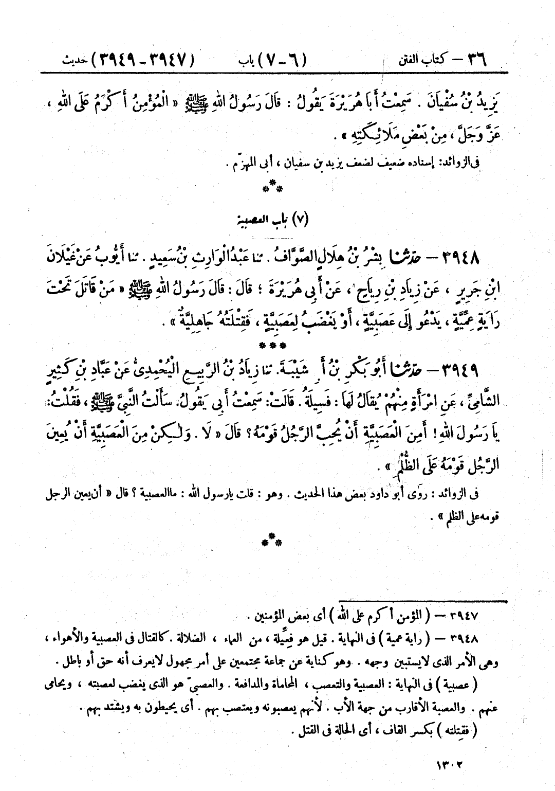 3949 - حَدَّثَنَا أَبُو بَكْرِ بْنُ أَبِي شَيْبَةَ قَالَ: حَدَّثَنَا زِيَادُ بْنُ الرَّبِيعِ الْيَحْمِدِيُّ، عَنْ عَبَّادِ بْنِ كَثِيرٍ الشَّامِيِّ، عَنِ امْرَأَةٍ مِنْهُمْ يُقَالُ لَهَا فُسَيْلَةُ، قَالَتْ: سَمِعْتُ أَبِي يَقُولُ، سَأَلْتُ النَّبِيَّ صَلَّى اللهُ عَلَيْهِ وَسَلَّمَ، فَقُلْتُ: يَا رَسُولَ اللَّهِ أَمِنَ الْعَصَبِيَّةِ أَنْ يُحِبَّ الرَّجُلُ قَوْمَهُ؟ قَالَ: «لَا، وَلَكِنْ §مِنَ الْعَصَبِيَّةِ أَنْ يُعِينَ الرَّجُلُ قَوْمَهُ عَلَى الظُّلْمِ»