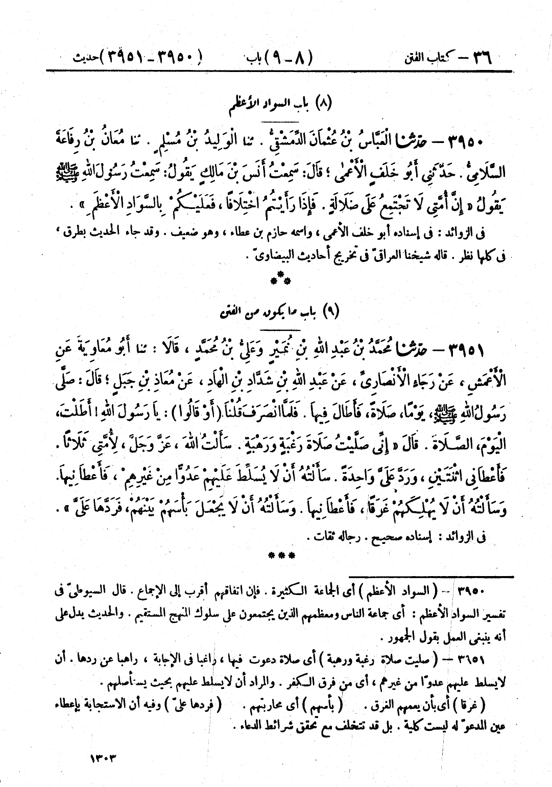 3951 - حَدَّثَنَا مُحَمَّدُ بْنُ عَبْدِ اللَّهِ بْنِ نُمَيْرٍ، وَعَلِيُّ بْنُ مُحَمَّدٍ، قَالَا: حَدَّثَنَا أَبُو مُعَاوِيَةَ، عَنِ الْأَعْمَشِ، عَنْ رَجَاءٍ الْأَنْصَارِيِّ، عَنْ عَبْدِ اللَّهِ بْنِ شَدَّادِ بْنِ الْهَادِ، عَنْ مُعَاذِ بْنِ جَبَلٍ، قَالَ: صَلَّى رَسُولُ اللَّهِ صَلَّى اللهُ عَلَيْهِ وَسَلَّمَ، يَوْمًا صَلَاةً، فَأَطَالَ فِيهَا، فَلَمَّا انْصَرَفَ قُلْنَا: - أَوْ قَالُوا: - يَا رَسُولَ اللَّهِ أَطَلْتَ الْيَوْمَ الصَّلَاةَ، قَالَ: «إِنِّي §صَلَّيْتُ صَلَاةَ رَغْبَةٍ وَرَهْبَةٍ، سَأَلْتُ اللَّهَ عَزَّ وَجَلَّ لِأُمَّتِي ثَلَاثًا، فَأَعْطَانِي اثْنَتَيْنِ وَرَدَّ عَلَيَّ وَاحِدَةً، سَأَلْتُهُ أَنْ لَا يُسَلِّطَ عَلَيْهِمْ عَدُوًّا مِنْ غَيْرِهِمْ، فَأَعْطَانِيهَا، وَسَأَلْتُهُ أَنْ لَا يُهْلِكَهُمْ غَرَقًا، فَأَعْطَانِيهَا، وَسَأَلْتُهُ أَنْ لَا يَجْعَلَ بَأْسَهُمْ بَيْنَهُمْ، فَرَدَّهَا عَلَيَّ»