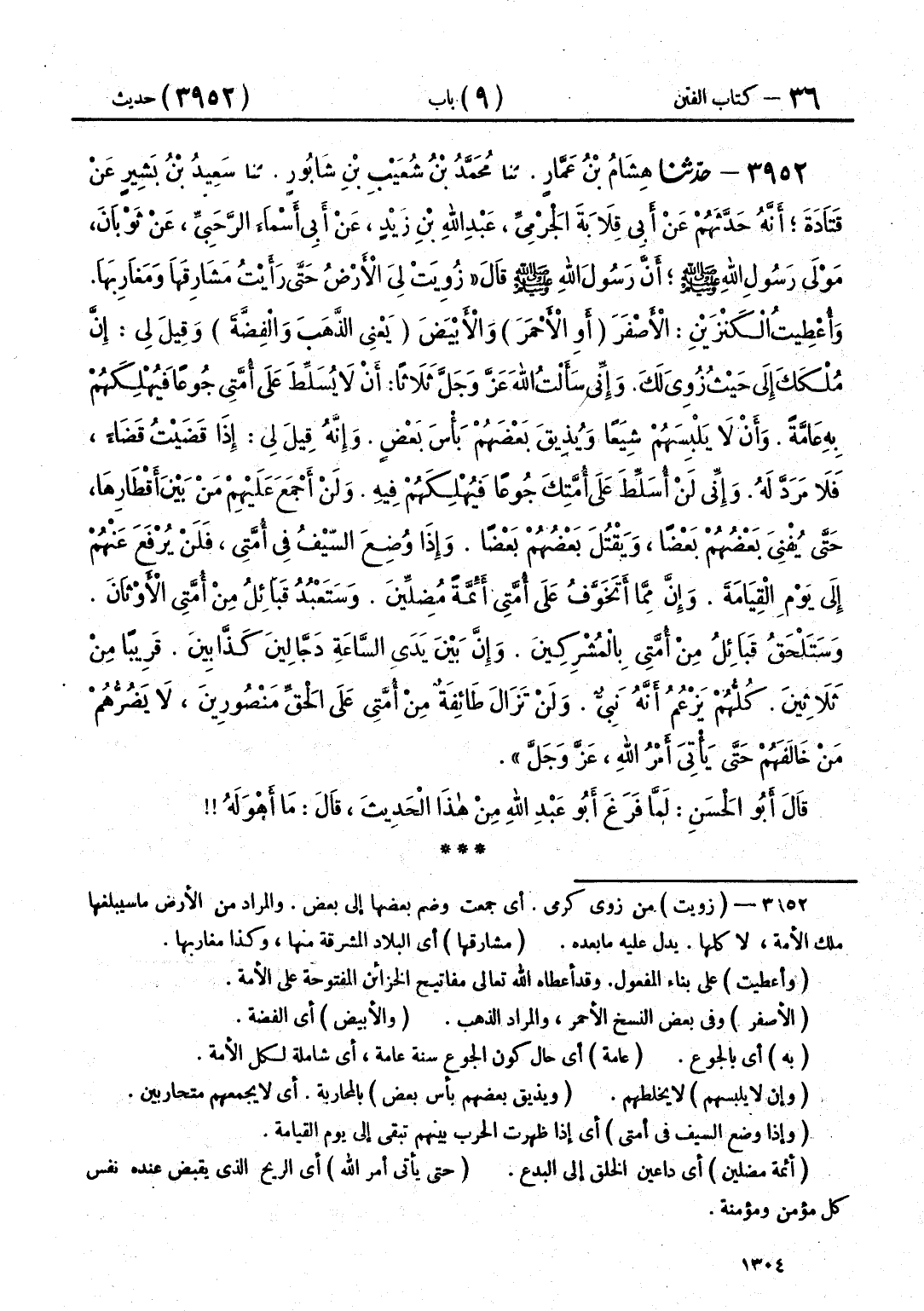 3952 - حَدَّثَنَا هِشَامُ بْنُ عَمَّارٍ قَالَ: حَدَّثَنَا مُحَمَّدُ بْنُ شُعَيْبِ بْنِ شَابُورَ قَالَ: حَدَّثَنَا سَعِيدُ بْنُ بَشِيرٍ، عَنْ قَتَادَةَ، أَنَّهُ حَدَّثَهُمْ، عَنْ أَبِي قِلَابَةَ الْجَرْمِيِّ عَبْدِ اللَّهِ بْنِ زَيْدٍ، عَنْ أَبِي أَسْمَاءَ الرَّحَبِيِّ، عَنْ ثَوْبَانَ، مَوْلَى رَسُولِ اللَّهِ صَلَّى اللهُ عَلَيْهِ وَسَلَّمَ، أَنَّ رَسُولَ اللَّهِ صَلَّى اللهُ عَلَيْهِ وَسَلَّمَ، قَالَ: " §زُوِيَتْ لِي الْأَرْضُ حَتَّى رَأَيْتُ مَشَارِقَهَا، وَمَغَارِبَهَا، وَأُعْطِيتُ الْكَنْزَيْنِ، الْأَصْفَرَ أَوِ الْأَحْمَرَ، وَالْأَبْيَضَ، يَعْنِي الذَّهَبَ وَالْفِضَّةَ، وَقِيلَ لِي: إِنَّ مُلْكَكَ إِلَى حَيْثُ زُوِيَ لَكَ، وَإِنِّي سَأَلْتُ اللَّهَ عَزَّ وَجَلَّ ثَلَاثًا، أَنْ لَا يُسَلِّطَ عَلَى أُمَّتِي جُوعًا فَيُهْلِكَهُمْ بِهِ عَامَّةً، وَأَنْ لَا يَلْبِسَهُمْ شِيَعًا، وَيُذِيقَ بَعْضَهُمْ بَأْسَ بَعْضٍ، وَإِنَّهُ قِيلَ لِي: إِذَا قَضَيْتُ قَضَاءً فَلَا مَرَدَّ لَهُ، وَإِنِّي لَنْ أُسَلِّطَ عَلَى أُمَّتِكَ جُوعًا فَيُهْلِكَهُمْ فِيهِ، وَلَنْ أَجْمَعَ عَلَيْهِمْ مِنْ بَيْنَ أَقْطَارِهَا حَتَّى يُفْنِيَ بَعْضُهُمْ بَعْضًا، وَيَقْتُلَ بَعْضُهُمْ بَعْضًا، وَإِذَا وُضِعَ السَّيْفُ فِي أُمَّتِي، فَلَنْ يُرْفَعَ عَنْهُمْ إِلَى يَوْمِ الْقِيَامَةِ، وَإِنَّ مِمَّا أَتَخَوَّفُ عَلَى أُمَّتِي أَئِمَّةً مُضِلِّينَ، وَسَتَعْبُدُ قَبَائِلُ مِنْ أُمَّتِي الْأَوْثَانَ، وَسَتَلْحَقُ قَبَائِلُ مِنْ أُمَّتِي بِالْمُشْرِكِينَ، وَإِنَّ بَيْنَ يَدَيِ السَّاعَةِ دَجَّالِينَ كَذَّابِينَ، قَرِيبًا مِنْ ثَلَاثِينَ، كُلُّهُمْ يَزْعُمُ أَنَّهُ نَبِيٌّ، وَلَنْ تَزَالَ طَائِفَةٌ مِنْ أُمَّتِي عَلَى الْحَقِّ مَنْصُورِينَ، لَا يَضُرُّهُمْ مَنْ خَالَفَهُمْ حَتَّى يَأْتِيَ أَمْرُ اللَّهِ عَزَّ وَجَلَّ " قَالَ أَبُو الْحَسَنِ: لَمَّا فَرَغَ أَبُو عَبْدِ اللَّهِ مِنْ هَذَا الْحَدِيثِ، قَالَ: «مَا أَهْوَلَهُ»
