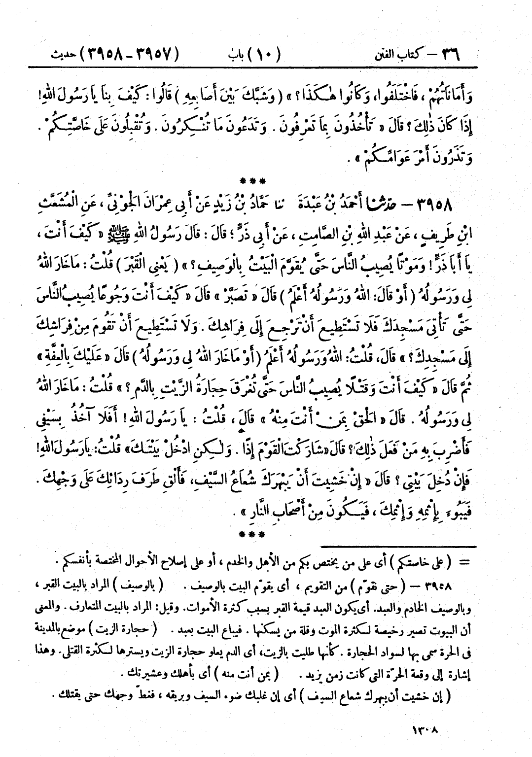 3958 - حَدَّثَنَا أَحْمَدُ بْنُ عَبْدَةَ قَالَ: حَدَّثَنَا حَمَّادُ بْنُ زَيْدٍ، عَنْ أَبِي عِمْرَانَ الْجَوْنِيِّ، عَنِ الْمُشَعَّثِ بْنِ طَرِيفٍ، عَنْ عَبْدِ اللَّهِ بْنِ الصَّامِتِ، عَنْ أَبِي ذَرٍّ، قَالَ: قَالَ رَسُولُ اللَّهِ صَلَّى اللهُ عَلَيْهِ وَسَلَّمَ: «§كَيْفَ أَنْتَ يَا أَبَا ذَرٍّ وَمَوْتًا يُصِيبُ النَّاسَ حَتَّى يُقَوَّمَ الْبَيْتُ بِالْوَصِيفِ؟» - يَعْنِي الْقَبْرَ - قُلْتُ: مَا خَارَ اللَّهُ لِي وَرَسُولُهُ - أَوْ قَالَ: اللَّهُ وَرَسُولُهُ أَعْلَمُ - قَالَ: «تَصَبَّرْ» قَالَ: «كَيْفَ أَنْتَ، وَجُوعًا يُصِيبُ النَّاسَ، حَتَّى تَأْتِيَ مَسْجِدَكَ فَلَا تَسْتَطِيعَ أَنْ تَرْجِعَ إِلَى فِرَاشِكَ، وَلَا تَسْتَطِيعَ أَنْ تَقُومَ مِنْ فِرَاشِكَ إِلَى مَسْجِدِكَ؟» قَالَ: قُلْتُ: اللَّهُ وَرَسُولُهُ أَعْلَمُ - أَوْ مَا خَارَ اللَّهُ لِي وَرَسُولُهُ - قَالَ: «عَلَيْكَ بِالْعِفَّةِ» ثُمَّ قَالَ: «كَيْفَ أَنْتَ، وَقَتْلًا يُصِيبُ النَّاسَ حَتَّى تُغْرَقَ حِجَارَةُ الزَّيْتِ بِالدَّمِ؟» قُلْتُ: مَا خَارَ اللَّهُ لِي وَرَسُولُهُ، قَالَ: «الْحَقْ بِمَنْ أَنْتَ مِنْهُ» ، قَالَ: قُلْتُ: يَا رَسُولَ اللَّهِ أَفَلَا آخُذُ بِسَيْفِي، فَأَضْرِبَ بِهِ مَنْ فَعَلَ ذَلِكَ، قَالَ: «شَارَكْتَ الْقَوْمَ إِذًا، وَلَكِنِ ادْخُلْ بَيْتَكَ» ، قُلْتُ: يَا رَسُولَ اللَّهِ فَإِنْ دُخِلَ بَيْتِي؟ قَالَ: «إِنْ خَشِيتَ أَنْ يَبْهَرَكَ شُعَاعُ السَّيْفِ، فَأَلْقِ طَرَفَ رِدَائِكَ عَلَى وَجْهِكَ، فَيَبُوءَ بِإِثْمِهِ وَإِثْمِكَ، فَيَكُونَ مِنْ أَصْحَابِ النَّارِ»