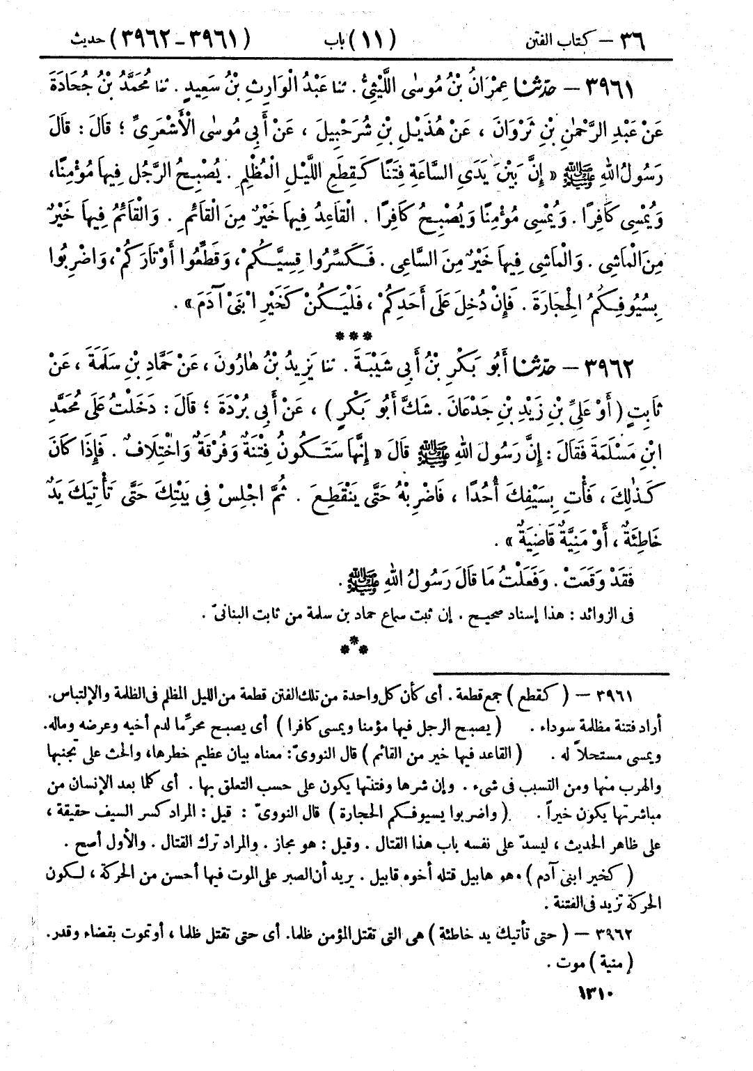 3961 - حَدَّثَنَا عِمْرَانُ بْنُ مُوسَى اللَّيْثِيُّ قَالَ: حَدَّثَنَا عَبْدُ الْوَارِثِ بْنُ سَعِيدٍ قَالَ: حَدَّثَنَا مُحَمَّدُ بْنُ جُحَادَةَ، عَنْ عَبْدِ الرَّحْمَنِ بْنِ ثَرْوَانَ، عَنْ هُزَيْلِ بْنِ شُرَحْبِيلَ، عَنْ أَبِي مُوسَى الْأَشْعَرِيِّ، قَالَ: قَالَ رَسُولُ اللَّهِ صَلَّى اللهُ عَلَيْهِ وَسَلَّمَ: «إِنَّ §بَيْنَ يَدَيِ السَّاعَةِ فِتَنًا كَقِطَعِ اللَّيْلِ الْمُظْلِمِ، يُصْبِحُ الرَّجُلُ فِيهَا مُؤْمِنًا، وَيُمْسِي كَافِرًا، وَيُمْسِي مُؤْمِنًا، وَيُصْبِحُ كَافِرًا، الْقَاعِدُ فِيهَا خَيْرٌ مِنَ الْقَائِمِ، وَالْقَائِمُ فِيهَا خَيْرٌ مِنَ الْمَاشِي، وَالْمَاشِي فِيهَا خَيْرٌ مِنَ السَّاعِي، فَكَسِّرُوا قِسِيَّكُمْ، وَقَطِّعُوا أَوْتَارَكُمْ، وَاضْرِبُوا بِسُيُوفِكُمُ الْحِجَارَةَ، فَإِنْ دُخِلَ عَلَى أَحَدِكُمْ، فَلْيَكُنْ كَخَيْرِ ابْنَيْ آدَمَ»