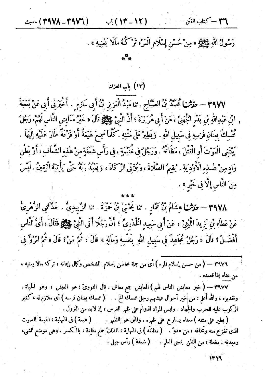 3977 - حَدَّثَنَا مُحَمَّدُ بْنُ الصَّبَّاحِ قَالَ: حَدَّثَنَا عَبْدُ الْعَزِيزِ بْنُ أَبِي حَازِمٍ قَالَ: أَخْبَرَنِي أَبِي، عَنْ بَعَجَةَ بْنِ عَبْدِ اللَّهِ بْنِ بَدْرٍ الْجُهَنِيِّ، عَنْ أَبِي هُرَيْرَةَ، أَنَّ النَّبِيَّ صَلَّى اللهُ عَلَيْهِ وَسَلَّمَ، قَالَ: «§خَيْرُ مَعَايِشِ النَّاسِ لَهُمْ، رَجُلٌ مُمْسِكٌ بِعِنَانِ فَرَسِهِ فِي سَبِيلِ اللَّهِ، وَيَطِيرُ عَلَى مَتْنِهِ، كُلَّمَا سَمِعَ هَيْعَةً أَوْ فَزْعَةً، طَارَ عَلَيْهِ إِلَيْهَا، يَبْتَغِي الْمَوْتَ أَوِ الْقَتْلَ مَظَانَّهُ، وَرَجُلٌ فِي غُنَيْمَةٍ فِي رَأْسِ شَعَفَةٍ مِنْ هَذِهِ الشِّعَافِ، أَوْ بَطْنِ وَادٍ مِنْ هَذِهِ الْأَوْدِيَةِ، يُقِيمُ الصَّلَاةَ، وَيُؤْتِي الزَّكَاةَ، وَيَعْبُدُ رَبَّهُ حَتَّى يَأْتِيَهُ الْيَقِينُ، لَيْسَ مِنَ النَّاسِ إِلَّا فِي خَيْرٍ»