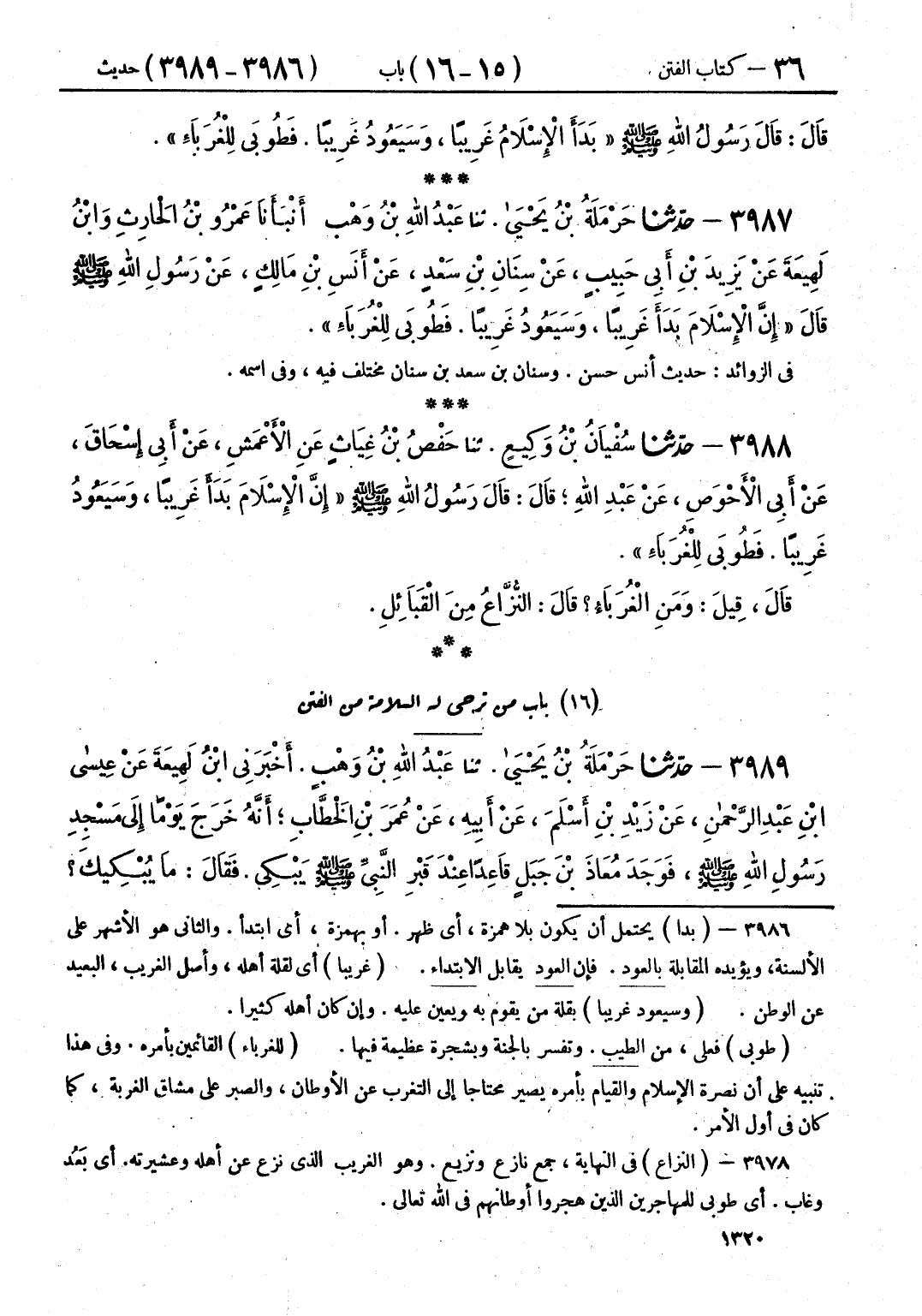 3987 - حَدَّثَنَا حَرْمَلَةُ بْنُ يَحْيَى قَالَ: حَدَّثَنَا عَبْدُ اللَّهِ بْنُ وَهْبٍ قَالَ: أَنْبَأَنَا عَمْرُو بْنُ الْحَارِثِ، وَابْنُ لَهِيعَةَ، عَنْ يَزِيدَ بْنِ أَبِي حَبِيبٍ، عَنْ سِنَانِ بْنِ سَعْدٍ، عَنْ أَنَسِ بْنِ مَالِكٍ، عَنْ رَسُولِ اللَّهِ صَلَّى اللهُ عَلَيْهِ وَسَلَّمَ، قَالَ: «إِنَّ §الْإِسْلَامَ بَدَأَ غَرِيبًا، وَسَيَعُودُ غَرِيبًا، فَطُوبَى لِلْغُرَبَاءِ»