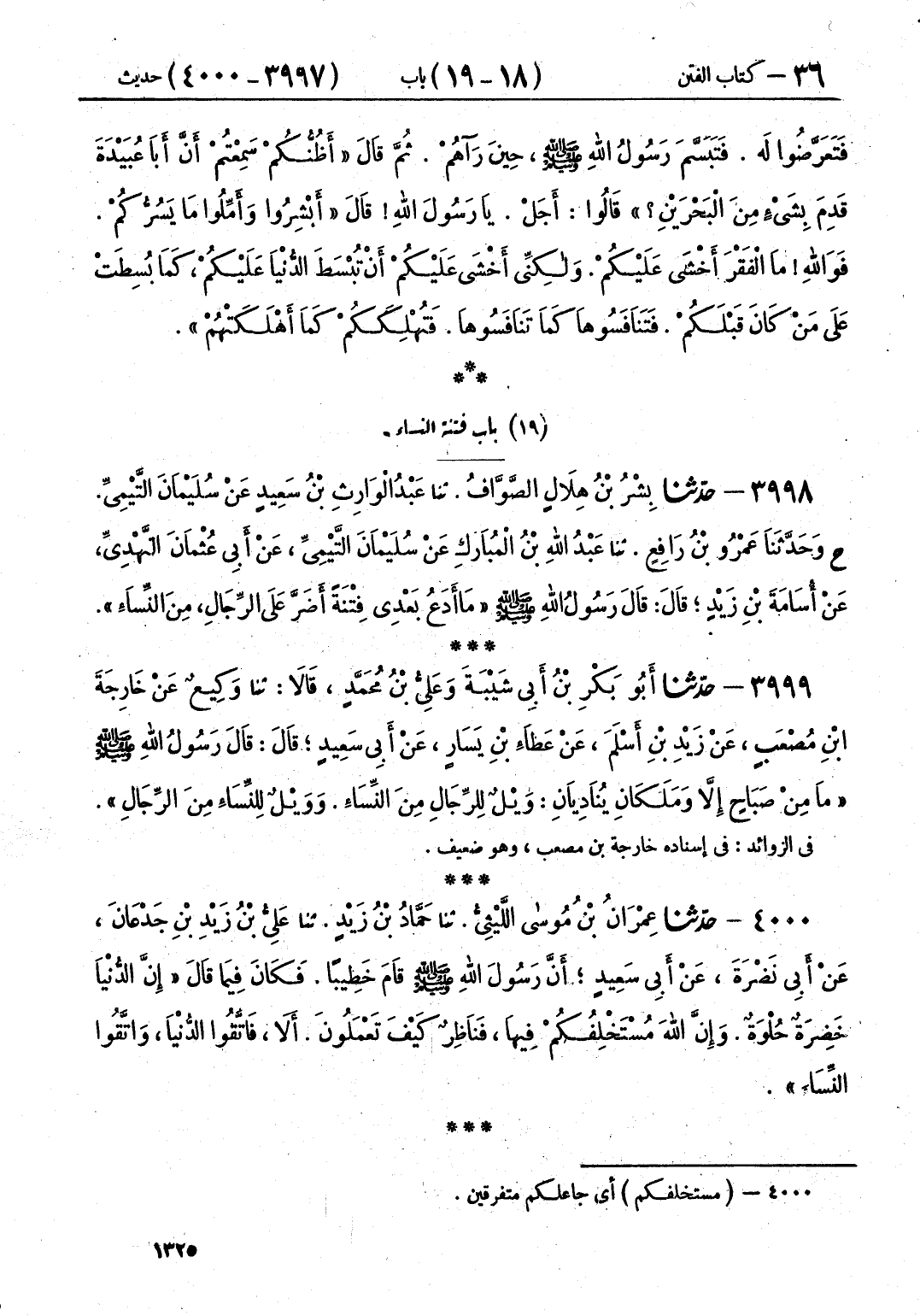 3998 - حَدَّثَنَا بِشْرُ بْنُ هِلَالٍ الصَّوَّافُ قَالَ: حَدَّثَنَا عَبْدُ الْوَارِثِ بْنُ سَعِيدٍ، عَنْ سُلَيْمَانَ التَّيْمِيِّ، ح وَحَدَّثَنَا عَمْرُو بْنُ رَافِعٍ قَالَ: حَدَّثَنَا عَبْدُ اللَّهِ بْنُ الْمُبَارَكِ، عَنْ سُلَيْمَانَ التَّيْمِيِّ، عَنْ أَبِي عُثْمَانَ النَّهْدِيِّ، عَنْ أُسَامَةَ بْنِ زَيْدٍ، قَالَ: قَالَ رَسُولُ اللَّهِ صَلَّى اللهُ عَلَيْهِ وَسَلَّمَ: «§مَا أَدَعُ بَعْدِي فِتْنَةً أَضَرَّ عَلَى الرِّجَالِ، مِنَ النِّسَاءِ»
