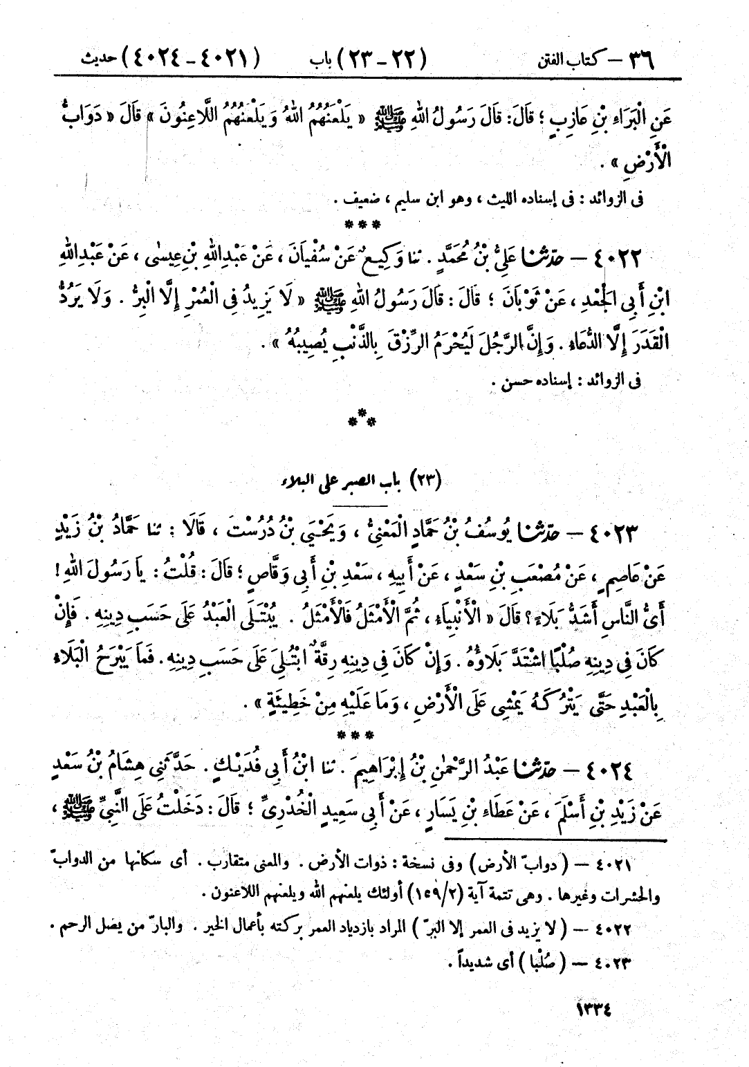 4023 - حَدَّثَنَا يُوسُفُ بْنُ حَمَّادٍ الْمَعْنِيُّ، وَيَحْيَى بْنُ دُرُسْتَ، قَالَا: حَدَّثَنَا حَمَّادُ بْنُ زَيْدٍ، عَنْ عَاصِمٍ، عَنْ مُصْعَبِ بْنِ سَعْدٍ، عَنْ أَبِيهِ، سَعْدِ بْنِ أَبِي وَقَّاصٍ، قَالَ: قُلْتُ: يَا رَسُولَ اللَّهِ §أَيُّ النَّاسِ أَشَدُّ بَلَاءً؟ قَالَ: «الْأَنْبِيَاءُ، ثُمَّ الْأَمْثَلُ فَالْأَمْثَلُ، يُبْتَلَى الْعَبْدُ عَلَى حَسَبِ دِينِهِ، فَإِنْ كَانَ فِي دِينِهِ صُلْبًا، اشْتَدَّ بَلَاؤُهُ، وَإِنْ كَانَ فِي دِينِهِ رِقَّةٌ، ابْتُلِيَ عَلَى حَسَبِ دِينِهِ، فَمَا يَبْرَحُ الْبَلَاءُ بِالْعَبْدِ، حَتَّى يَتْرُكَهُ يَمْشِي عَلَى الْأَرْضِ، وَمَا عَلَيْهِ مِنْ خَطِيئَةٍ»