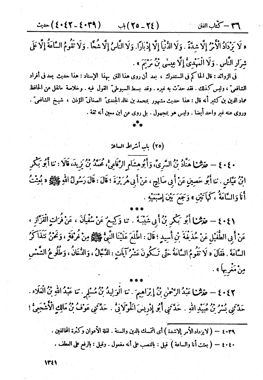 4041 - حَدَّثَنَا أَبُو بَكْرِ بْنُ أَبِي شَيْبَةَ قَالَ: حَدَّثَنَا وَكِيعٌ، عَنْ سُفْيَانَ، عَنْ فُرَاتٍ الْقَزَّازِ، عَنْ أَبِي الطُّفَيْلِ، عَنْ حُذَيْفَةَ بْنِ أَسِيدٍ، قَالَ: اطَّلَعَ عَلَيْنَا النَّبِيُّ صَلَّى اللهُ عَلَيْهِ وَسَلَّمَ مِنْ غُرْفَةٍ وَنَحْنُ نَتَذَاكَرُ السَّاعَةَ، فَقَالَ: «§لَا تَقُومُ السَّاعَةُ حَتَّى تَكُونَ عَشْرُ آيَاتٍ الدَّجَّالُ، وَالدُّخَانُ، وَطُلُوعُ الشَّمْسِ مِنْ مَغْرِبِهَا»