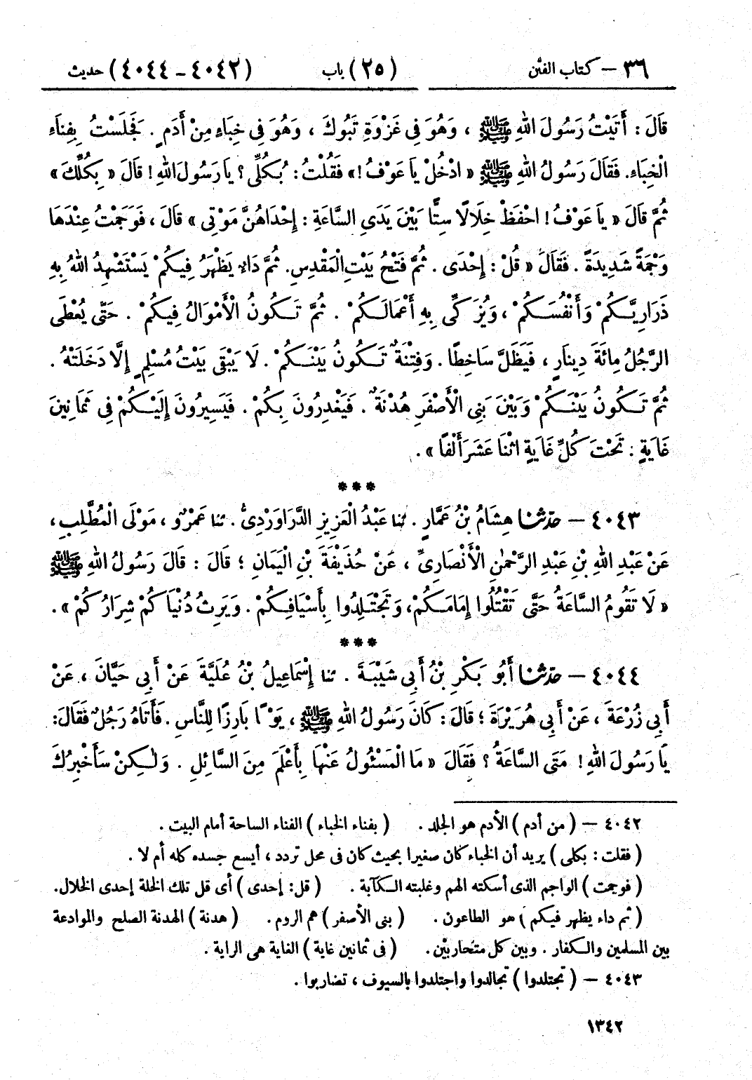 4043 - حَدَّثَنَا هِشَامُ بْنُ عَمَّارٍ قَالَ: حَدَّثَنَا عَبْدُ الْعَزِيزِ الدَّرَاوَرْدِيُّ قَالَ: حَدَّثَنَا عَمْرٌو، مَوْلَى الْمُطَّلِبِ، عَنْ عَبْدِ اللَّهِ بْنِ عَبْدِ الرَّحْمَنِ الْأَنْصَارِيِّ، عَنْ حُذَيْفَةَ بْنِ الْيَمَانِ، قَالَ: قَالَ رَسُولُ اللَّهِ صَلَّى اللهُ عَلَيْهِ وَسَلَّمَ: «§لَا تَقُومُ السَّاعَةُ حَتَّى تَقْتُلُوا إِمَامَكُمْ، وَتَجْتَلِدُوا بِأَسْيَافِكُمْ، وَيَرِثُ دُنْيَاكُمْ شِرَارُكُمْ»