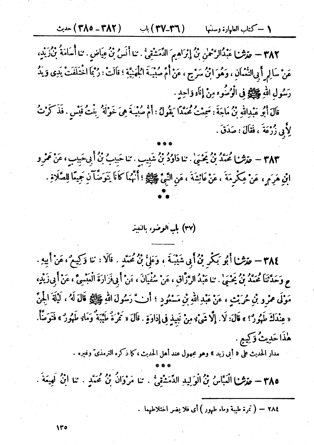 384 - حَدَّثَنَا أَبُو بَكْرِ بْنُ أَبِي شَيْبَةَ وَعَلِيُّ بْنُ مُحَمَّدٍ، قَالَا: حَدَّثَنَا وَكِيعٌ، عَنْ أَبِيهِ، ح، وحَدَّثَنَا مُحَمَّدُ بْنُ يَحْيَى قَالَ: حَدَّثَنَا عَبْدُ الرَّزَّاقِ، عَنْ سُفْيَانَ، عَنْ أَبِي فَزَارَةَ الْعَبْسِيِّ، عَنْ أَبِي زَيْدٍ مَوْلَى عَمْرِو بْنِ حُرَيْثٍ، عَنْ عَبْدِ اللَّهِ بْنِ مَسْعُودٍ، أَنَّ رَسُولَ اللَّهِ صَلَّى اللهُ عَلَيْهِ وَسَلَّمَ قَالَ لَهُ لَيْلَةَ الْجِنِّ «عِنْدَكَ طَهُورٌ» قَالَ: لَا، إِلَّا شَيْءٌ مِنْ نَبِيذٍ فِي إِدَاوَةٍ، قَالَ: «§تَمْرَةٌ طَيِّبَةٌ، وَمَاءٌ طَهُورٌ» فَتَوَضَّأَ هَذَا حَدِيثُ وَكِيعٍ