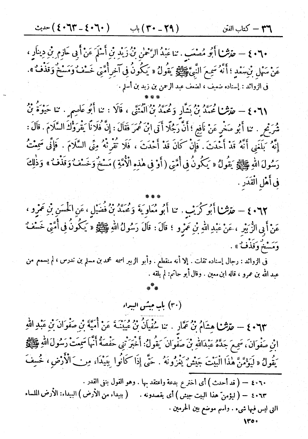 4060 - حَدَّثَنَا أَبُو مُصْعَبٍ قَالَ: حَدَّثَنَا عَبْدُ الرَّحْمَنِ بْنُ زَيْدِ بْنِ أَسْلَمَ، عَنْ أَبِي حَازِمِ بْنِ دِينَارٍ، عَنْ سَهْلِ بْنِ سَعْدٍ، أَنَّهُ سَمِعَ النَّبِيَّ صَلَّى اللهُ عَلَيْهِ وَسَلَّمَ، يَقُولُ: «§يَكُونُ فِي آخِرِ أُمَّتِي خَسْفٌ، وَمَسْخٌ، وَقَذْفٌ»