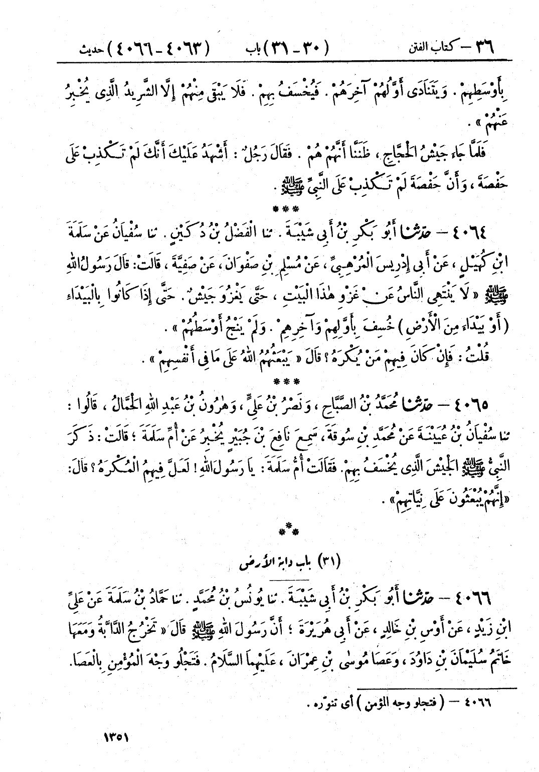 4064 - حَدَّثَنَا أَبُو بَكْرِ بْنُ أَبِي شَيْبَةَ قَالَ: حَدَّثَنَا الْفَضْلُ بْنُ دُكَيْنٍ قَالَ: حَدَّثَنَا سُفْيَانُ، عَنْ سَلَمَةَ بْنِ كُهَيْلٍ، عَنْ أَبِي إِدْرِيسَ الْمُرْهِبِيِّ، عَنْ مُسْلِمِ بْنِ صَفْوَانَ، عَنْ صَفِيَّةَ، قَالَتْ: قَالَ رَسُولُ اللَّهِ صَلَّى اللهُ عَلَيْهِ وَسَلَّمَ: «§لَا يَنْتَهِي النَّاسُ عَنْ غَزْوِ هَذَا الْبَيْتِ، حَتَّى يَغْزُوَ جَيْشٌ حَتَّى إِذَا كَانُوا بِالْبَيْدَاءِ، أَوْ بَيْدَاءَ مِنَ الْأَرْضِ، خُسِفَ بِأَوَّلِهِمْ وَآخِرِهِمْ، وَلَمْ يَنْجُ أَوْسَطُهُمْ» ، قُلْتُ: فَإِنْ كَانَ فِيهِمْ مَنْ يُكْرَهُ؟ قَالَ: «يَبْعَثُهُمُ اللَّهُ عَلَى مَا فِي أَنْفُسِهِمْ»