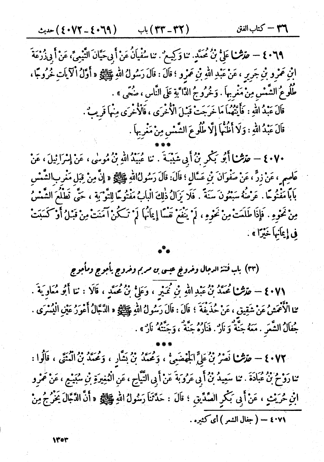 4069 - حَدَّثَنَا عَلِيُّ بْنُ مُحَمَّدٍ قَالَ: حَدَّثَنَا وَكِيعٌ قَالَ: حَدَّثَنَا سُفْيَانُ، عَنْ أَبِي حَيَّانَ التَّيْمِيِّ، عَنْ أَبِي زُرْعَةَ بْنِ عَمْرِو بْنِ جَرِيرٍ، عَنْ عَبْدِ اللَّهِ بْنِ عَمْرٍو، قَالَ: قَالَ رَسُولُ اللَّهِ صَلَّى اللهُ عَلَيْهِ وَسَلَّمَ: «§أَوَّلُ الْآيَاتِ خُرُوجًا، طُلُوعُ الشَّمْسِ مِنْ مَغْرِبِهَا، وَخُرُوجُ الدَّابَّةِ عَلَى النَّاسِ ضُحًى» ، قَالَ عَبْدُ اللَّهِ: «فَأَيَّتُهُمَا مَا خَرَجَتْ قَبْلَ الْأُخْرَى فَالْأُخْرَى مِنْهَا قَرِيبٌ» ، قَالَ عَبْدُ اللَّهِ: «وَلَا أَظُنُّهَا إِلَّا طُلُوعَ الشَّمْسِ مِنْ مَغْرِبِهَا»